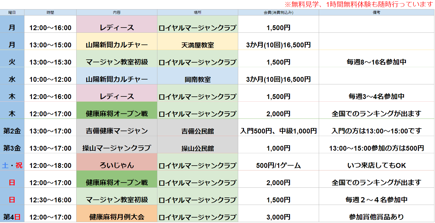 ロイヤルマージャンCL岡山県 ロイヤルマージャンシーエル 岡山県 備前西市駅 徒歩5分 セット、健康麻雀、麻雀教室、ノーレート 電話する086-246-3822 地図 店舗トップ ルール 写真/動画 イベント 求人 クーポン プロ イチオシ ランキング クチコミ イベント詳細 イベント 週間スケジュール 固定イベント 健康麻将、初心者教室、レディース教室、ノーレートフリーの日程です。 イベント 【土曜】4人打ちノーレートフリー健康マージャン ろいじゃん 固定イベント 2020年1月開設 お一人でいつでも参加できる 4人打ちノーレートフリー健康マージャン ろいじゃん 毎週土曜日・祝日 12:00~18:00 1半荘500円(時間無制限) ・フリードリンク ・当会場レーティングシステムを採用 天鳳割(チケット購入時に受付でお申しつけ下さい) ・天鳳初段~六段の方は500円引き ・七段以上は1000円引き 詳しくはホームページをご覧ください さらに読み込む... 次の6件〜2件/全2件の検索 お店のコトを友達に教える Facebook X(旧Twitter) Line Mail お店を評価する 閉店・休業・移転・情報違い報告 クチコミ投稿 報告内容詳細※必須 閉店 休業 移転 情報違い 送信する