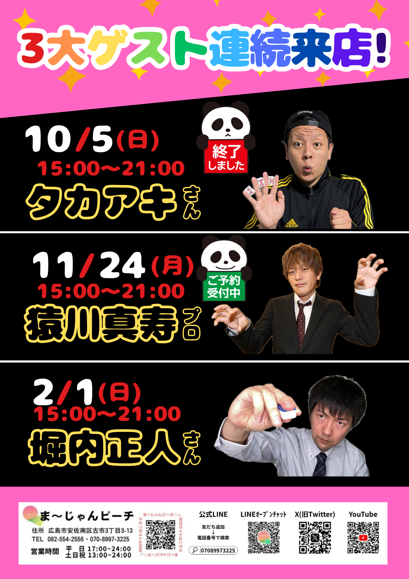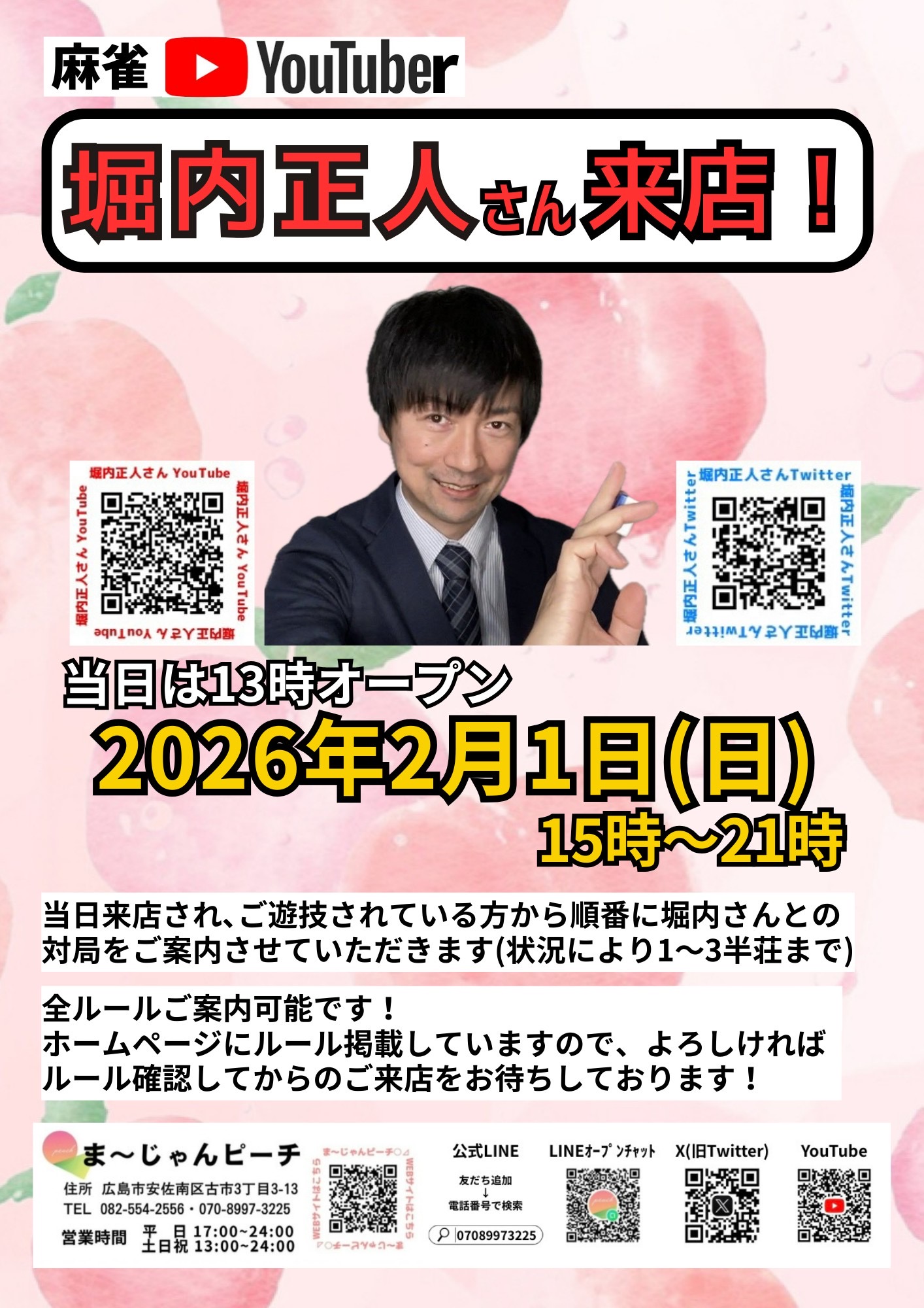 まーじゃんピーチ広島県 マージャンピーチ 広島県 古市橋駅 徒歩3分 三麻、ノーレート、セット、フリー 電話する082-554-2556 地図 店舗トップ ルール 写真/動画 イベント 求人 クーポン プロ イチオシ ランキング クチコミ イベント詳細 イベント 2026年2月1日(日) 麻雀YouTuber 堀内正人さん来店! 日時 : 2026年2月1日(日)~2026年2月1日(日) 2026年2月1日(日) 15:00~21:00 麻雀YouTuber 堀内正人さん来店! 全ルールご案内可能です! 当日来店され、ご遊技されている方から順番に堀内さんとの対局をご案内いたします。(状況により1~3半荘) イベント 2025年11月24日(月祝) 日本プロ麻雀連盟 猿川真寿プロ来店! 日時 : 2025年11月24日(月)~2025年11月24日(月) 2025年11月24日(月祝) 15:00~21:00 日本プロ麻雀連盟 猿川真寿プロ来店! ⚠️23日(日)から日程変更しました。 当日は ・当店通常ルール 3人打ちノーレートフリー(1G400円) ・箱下なしMリーグルール 4人打ちノーレートフリー(1G500円) のご案内となります。 猿川プロとの対局は、対局チケットが必要となります。 さらに読み込む... 次の6件〜2件/全2件の検索 お店のコトを友達に教える Facebook X(旧Twitter) Line Mail お店を評価する 閉店・休業・移転・情報違い報告 クチコミ投稿 報告内容詳細※必須 閉店 休業 移転 情報違い 送信する
