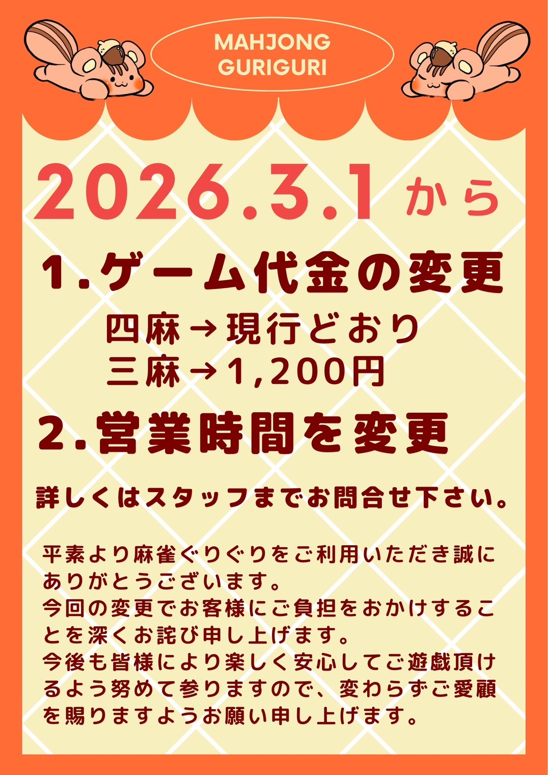 麻雀ぐりぐり 松戸店千葉県 マージャングリグリマツドテン 千葉県 松戸駅 徒歩30秒!! 四麻、三麻、セット、フリー 電話する047-702-7088 地図 店舗トップ ルール 写真/動画 イベント 求人 クーポン プロ イチオシ ランキング クチコミ イベント詳細 イベント セットはハイクオリティのサービスでご案内‼️ 固定イベント セットは麻雀ぐりぐり松戸店が断然お得🥺💸 ⚠️平日限定パック割引き開催中⚠️ ※土日祝は通常料金でのご案内となります。 上記画像を参照ください🤩🤩🤩 ①全卓、Mリーグでもお馴染みの最新アモスレックスⅢ‼️ ②女性や初めてのお客様でも入りやすい明るく綺麗な店内🌴🌿🍀 ③25種類の豊富なフリードリンク🥤🍹🧉 ※パックの時間を超過した延長料金は1300円/時間 ※年末年始、GW、お盆休み等は料金の変更がある場合があります。 イベント ぐりぐりからのお知らせ 固定イベント 3月1日より3麻のゲーム代と営業時間が変更になります。 皆様にご不便をお掛け致しますが今後もご愛顧賜りますようお願い申し上げます。 さらに読み込む... 次の6件〜2件/全2件の検索 お店のコトを友達に教える Facebook X(旧Twitter) Line Mail お店を評価する 閉店・休業・移転・情報違い報告 クチコミ投稿 報告内容詳細※必須 閉店 休業 移転 情報違い 送信する