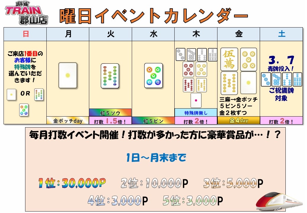 麻雀TRAIN 郡山店福島県 マージャントレインコオリヤマテン 福島県 郡山駅 車で15分 四麻、三麻、セット、フリー 電話する024-900-9910 地図 店舗トップ ルール 写真/動画 イベント 求人 クーポン プロ イチオシ ランキング クチコミ イベント詳細 イベント ご新規様必見╹͙╹͙╹͙╹͙ 日時 : 2026年4月1日(水)~2026年5月31日(日) ご新規様ご来店2回目以降、なんと╹͙╹͙╹͙╹͙1ヶ月間ゲーム代半額ですᐠ( ̤˃ᗨ˂ ̤)ᐟ✩°. イベント 4月5月ビックイベント開催╹͙╹͙╹͙╹͙ 日時 : 2026年4月1日(水)~2026年5月31日(日) 4.5月合同ビックイベント開催⭐️ とてもお得な🉐チケット配布期間です! *TRAIN郡山店のLINE登録必須 イベント ★曜日イベントカレンダー★曜日によっていろいろな特殊牌に替えてます✧˖°打数イベントは週3回倍dayを設けております! 固定イベント さらに読み込む... 次の6件〜3件/全3件の検索 お店のコトを友達に教える Facebook X(旧Twitter) Line Mail お店を評価する 閉店・休業・移転・情報違い報告 クチコミ投稿 報告内容詳細※必須 閉店 休業 移転 情報違い 送信する