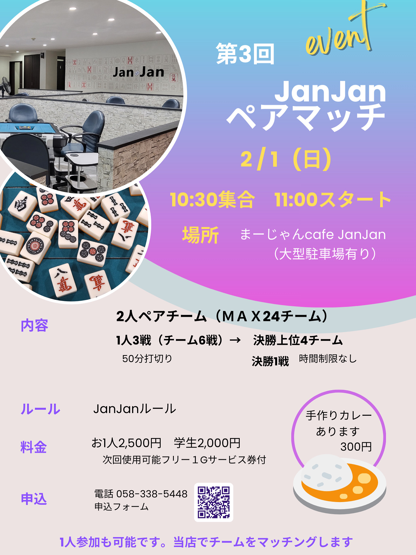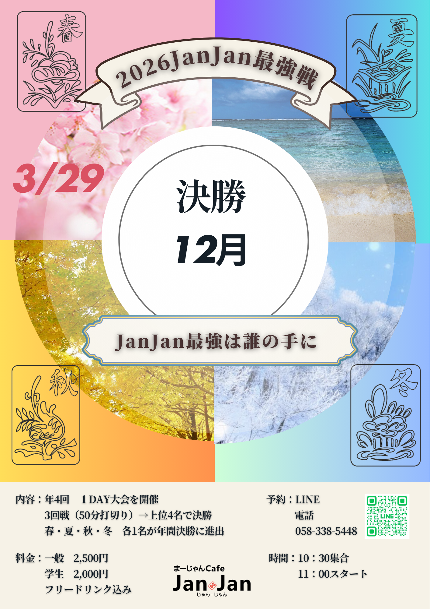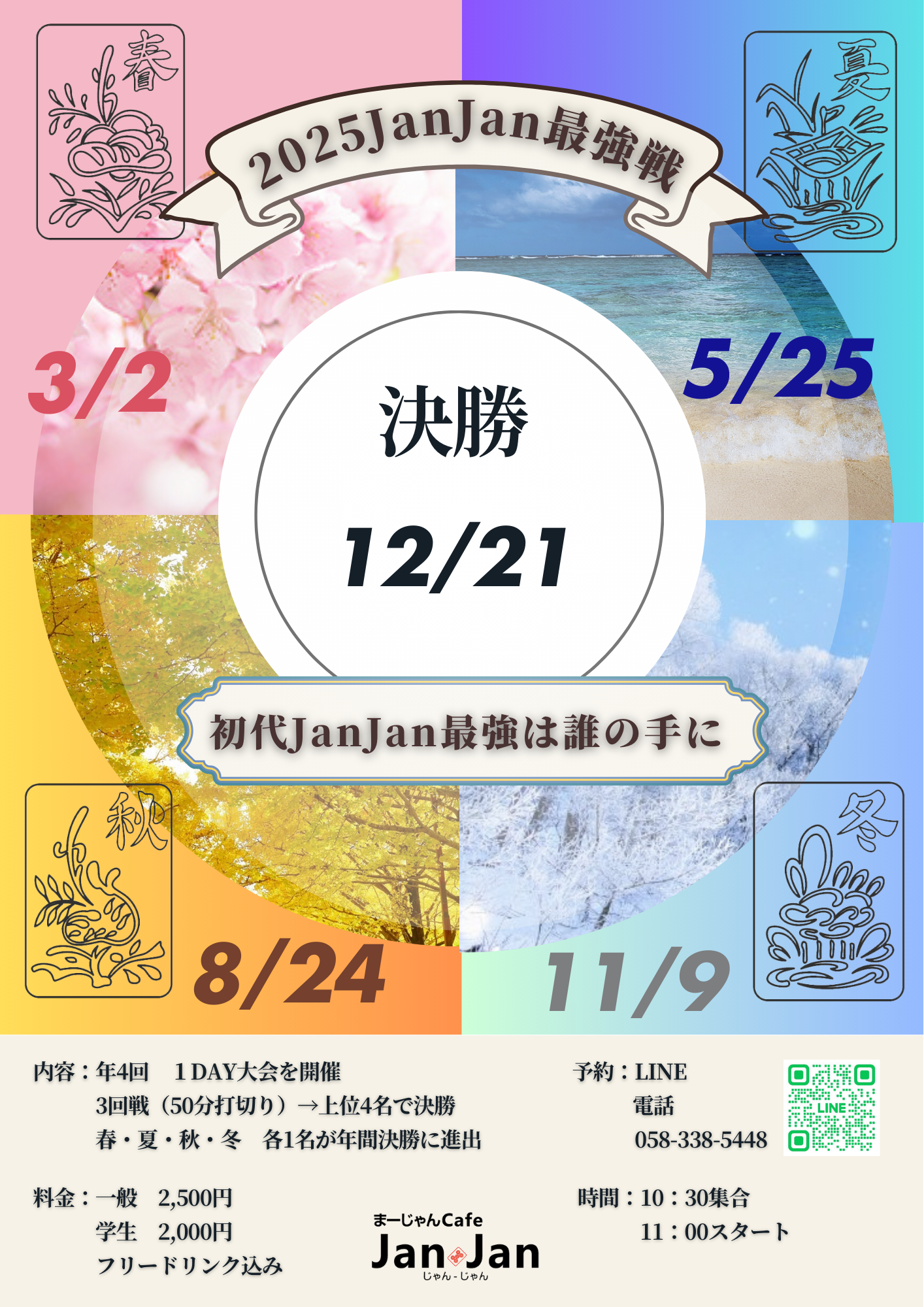 まーじゃんcafe JanJan岐阜県 マージャンカフェジャンジャン 岐阜県 岐阜駅 2.48km 四麻、ノーレート、麻雀教室、健康麻雀、セット、フリー 電話する058-338-5448 地図 店舗トップ ルール 写真/動画 イベント 求人 クーポン プロ イチオシ ランキング クチコミ イベント詳細 イベント 2026JanJan最強戦 日時 : 2026年3月29日(日)~2026年12月25日(金) 今年もJanJan最強戦開催決定しました 【春】3月29日(日) 12月の年間決勝戦出場かけて春の1DAY大会を行います。 エントリー受付中!! イベント 第3回JanJanペアマッチ 日時 : 2026年2月1日(日)~2026年2月1日(日) 第3回JanJanペアマッチ開催決定!! 友達、知り合い、家族とペアを組んで優勝目指しましょう! 決勝戦に進んだペアはMリーグさながらの放送対局に出場できます。 1人での参加もOK!当店でペアを組ませていただきます。 申し込みは下記のGoogleフォームでお願いします。 https://forms.gle/czv1H197bJHx7rJt7 イベント 2025JanJan最強戦 日時 : 2025年1月15日(水)~2025年11月9日(日) 初代JanJan最強は誰の手に!! 年4回 3/2・5/25・8/24・11/9に1DAY大会を開催 3回戦(50分打切り)→上位4名で決勝 春・夏・秋・冬 各1名が年間決勝に進出できます。 料金 一般2500円 学生2000円 フリードリンク込み 春・夏・秋・冬の優勝者の方にはJanJanフリー1日券プレゼント!! お申込みお待ちしております! イベント JanJan冬の陣 日時 : 2024年11月1日(金)~2024年12月22日(日) 期間中に獲得したポイント合計上位8名が 決勝進出!! イベント 学生フリー麻雀キャンペーン 固定イベント 学生フリー麻雀キャンペーン!! フリー麻雀初めての方、いつも打っている方もキャンペーンの機会に是非お越しください。 さらに読み込む... 次の6件〜10件/全18件の検索 お店のコトを友達に教える Facebook X(旧Twitter) Line Mail お店を評価する 閉店・休業・移転・情報違い報告 クチコミ投稿 報告内容詳細※必須 閉店 休業 移転 情報違い 送信する