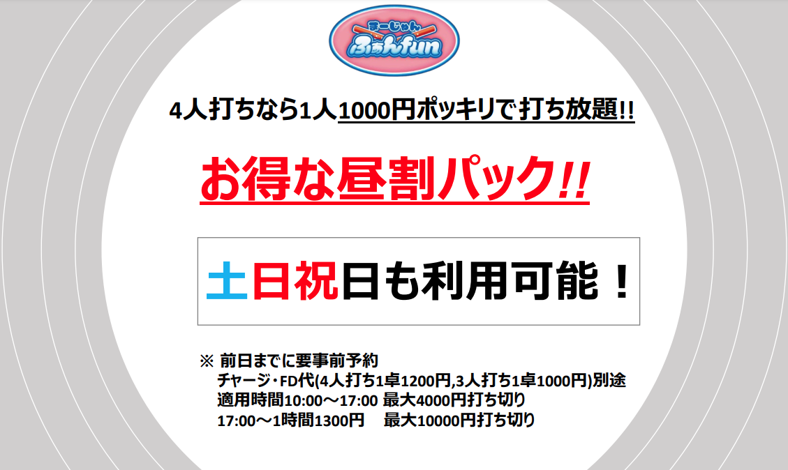 2025.02.07 オープン OPEN麻雀 ふぁんfun愛知県 マージャンファンファン 愛知県 伏見駅 徒歩3分 三麻、セット、フリー 電話する052-746-9739 地図 店舗トップ ルール 写真/動画 イベント 求人 クーポン プロ イチオシ ランキング クチコミ イベント詳細 スポットライトイベント イベント 土日祝日も使える昼割パック4000円! 日時 : 2025年2月1日(土)~2025年12月31日(水) 平日、土日祝日関係なく10時~17時は昼割パックで打ち切り1卓4000円! 終日打たれる方も自動で終日パック10000円に切り替わるのでめちゃ安! イベント ☆1周年イベント開催☆ 日時 : 2026年2月6日(金)~2026年2月15日(日) 1周年の感謝を込めて期間中はセット平日17時以降も1時間1000円!! もちろんフリーのほうも”色々”やっております!! 詳細はご来店して店内で確認を! 2年目も全力営業していきますのでよろしくお願いします!!! イベント 貸卓セットの終日パックが大変お得です! 日時 : 2026年1月5日(月)~2028年12月31日(日) 平日なら何時間打っても1卓8000円 土日祝日でも終日10000円と他店様の追随を許さない激安パック料金あります! 長く麻雀打つ方は是非ふぁんfunの貸卓パックをどうぞ! イベント 土日祝日フリー早割!最大半額! 日時 : 2025年2月1日(土)~2026年12月31日(木) 土日祝日に11時までに来店するとゲーム代が半額になるチャンス! ご遊戯G数が1~10本の方は50%で 11~20本の方は66%で 21~30本の方は83%で 31本以上の方は100%ゲーム代半額! (例)12本ご遊戯のお客様がいた場合 66%で成功のチャレンジ→成功した場合12本×G代半額の150円=1800円のキャッシュバック! イベント フリー月替わりイベント(非常に強力!) 日時 : 2026年1月1日(木)~2026年12月30日(水) 地域最高のフリー還元率です! 是非一度店舗に来て内容確認してください♪ さらに読み込む... 次の6件〜6件/全6件の検索 お店のコトを友達に教える Facebook X(旧Twitter) Line Mail お店を評価する 閉店・休業・移転・情報違い報告 クチコミ投稿 報告内容詳細※必須 閉店 休業 移転 情報違い 送信する