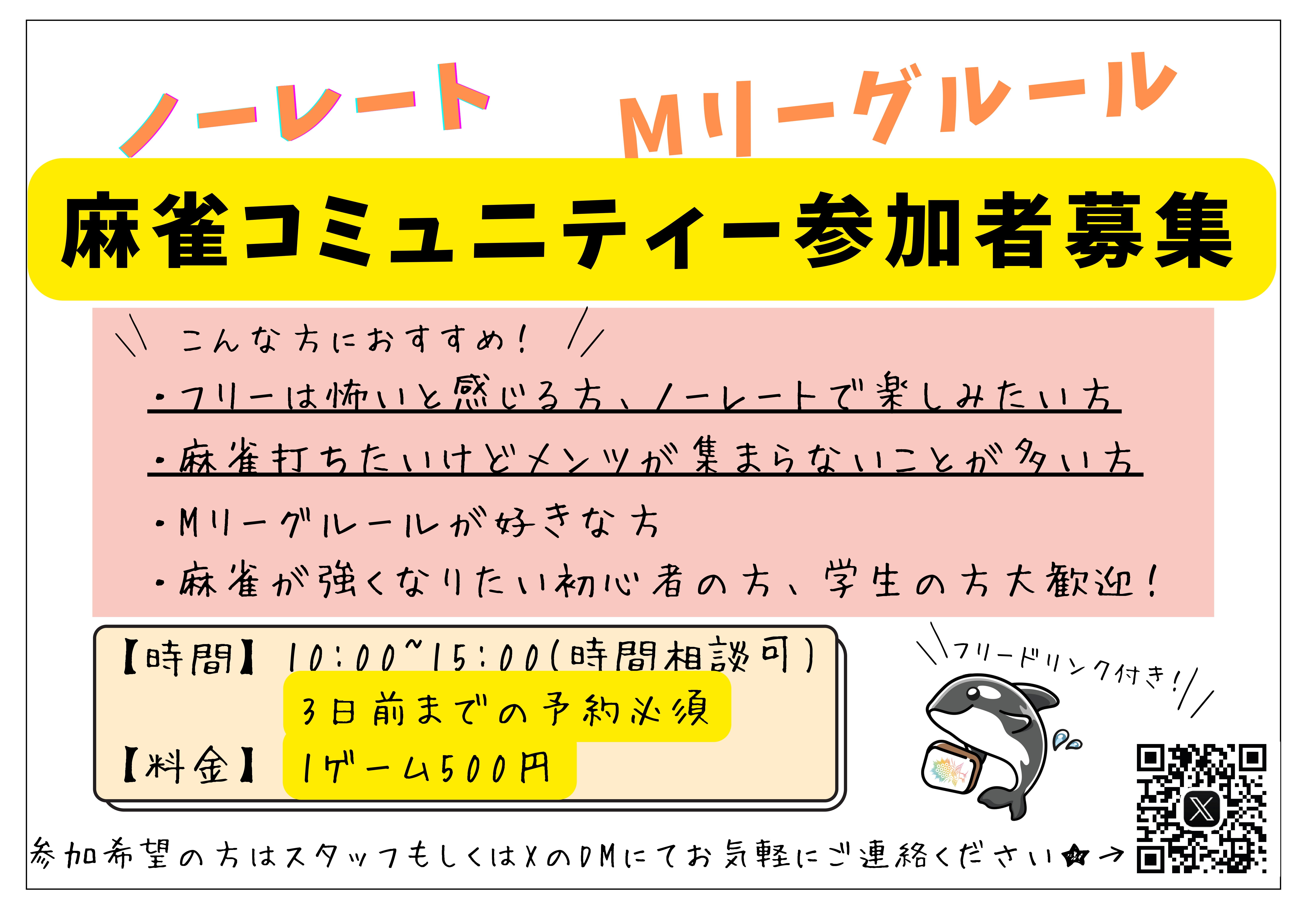 まーじゃんみっくす千葉県 マージャン ミックス 千葉県 江戸川台駅 東口より徒歩2分 四麻、三麻、ノーレート、健康麻雀、セット、フリー、麻雀教室 電話する04-7156-0118 地図 店舗トップ ルール 写真/動画 イベント 求人 クーポン プロ イチオシ ランキング クチコミ イベント詳細 イベント 第1回みっくす麻雀大会! 日時 : 2025年10月4日(土)~2025年10月19日(日) この度、当店にて 第1回みっくす麻雀大会を 開催いたします! ▶開催日:10月26日(日) ▶時間:12:00〜19:00 ▶参加費:5,000円 今回は学生から大人まで、全ての方が真剣勝負を楽しんでいただける大会となっております! 腕に自信のある方はもちろん、 真剣な対局の空気を味わいたい方や麻雀仲間を増やしたい方の ご参加も大歓迎です! 参加希望の方は、お早めにスタッフまでお声がけください。 定員に達し次第、受付を締め切らせていただきます。 ご参加を心よりお待ちしております! イベント NEW!!JACKPOT!!リニューアル!!三麻ver 固定イベント 三麻の条件 リーチ後、ピンク北を抜いてツモだったら「JACKPOT!!」 四麻の条件 リーチして一発でツモった牌が裏ドラだったら「JACKPOT!!」 みんなでたくさんリーチをしよう!! イベント 麻雀初心者の方向けの麻雀教室も実施しています!! 日時 : 2025年2月3日(月)~2035年2月3日(土) 麻雀のルールを1から学びたい方向けの麻雀教室を実施しています! 料金:1,500円/1時間(講師代、貸卓代、フリードリンク代込み) ※完全予約制です 日本プロ麻雀連盟所属の女流プロが1から丁寧に麻雀のルールや所作を教えます! 2日前までの予約必須ですので、参加希望の方はお電話にてご連絡ください。 イベント ☆ノーレート☆Mリーグルール☆みっくすMルールクラブ参加者募集中! 日時 : 2024年12月7日(土)~2039年12月7日(水) この度、ノーレート、Mリーグルールで、麻雀を打ちたいという方向けのコミュニティーを作成しました! ノーレートで麻雀を打ちたい方や初心者・中級者の方を大募集中です! 【場所】 まーじゃんみっくす 【ルール】 ノーレート、Mリーグルール(50分+1局) 【時間】 10:00〜15:00(予定) ※3日前までの予約必須です 【料金】 500円/1半荘 ※学割あります ※フリードリンク付きです 今のところ不定期開催ですので参加ご希望の方は、お電話かXのDMにてご連絡ください!! イベント 役満コレクション 固定イベント みんなで役満を狙え! さらに読み込む... 次の6件〜5件/全5件の検索 お店のコトを友達に教える Facebook X(旧Twitter) Line Mail お店を評価する 閉店・休業・移転・情報違い報告 クチコミ投稿 報告内容詳細※必須 閉店 休業 移転 情報違い 送信する