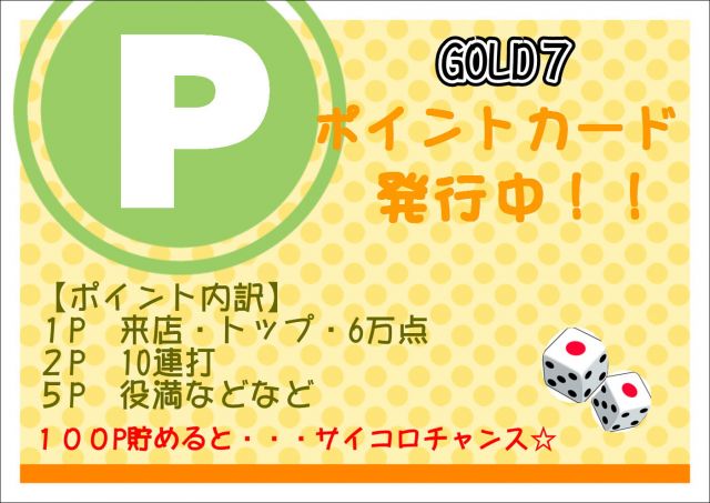 GOLD7(ゴールドセブン)山梨県 ゴールドセブン 山梨県 甲斐住吉駅 徒歩7分 セット、フリー 電話する055-243-1857 地図 店舗トップ ルール 写真/動画 イベント 求人 クーポン プロ イチオシ ランキング クチコミ イベント詳細 スポットライトイベント イベント GOLD7ラッシュ! 固定イベント ゴールドチーピン一発ツモ or 7万点トップでラッシュ突入!! 詳細は店舗にて! イベント 嬉しいポイントカード発行中☆ 固定イベント ポイントカード発行中★ 【ポイント内訳】 1P 来店・トップ・6万点 2P 10連打 5P 役満 など100P貯めると・・・ サイコロチャンス!!(∩´∀`)∩ワーイ イベント 無料駐車場ご用意しております。 固定イベント 当店ではお店の前に4台、裏に10台分 無料駐車場をご用意しております!! お車での御来店もお気軽にどうぞ☆ さらに読み込む... 次の6件〜3件/全3件の検索 お店のコトを友達に教える Facebook X(旧Twitter) Line Mail お店を評価する 閉店・休業・移転・情報違い報告 クチコミ投稿 報告内容詳細※必須 閉店 休業 移転 情報違い 送信する