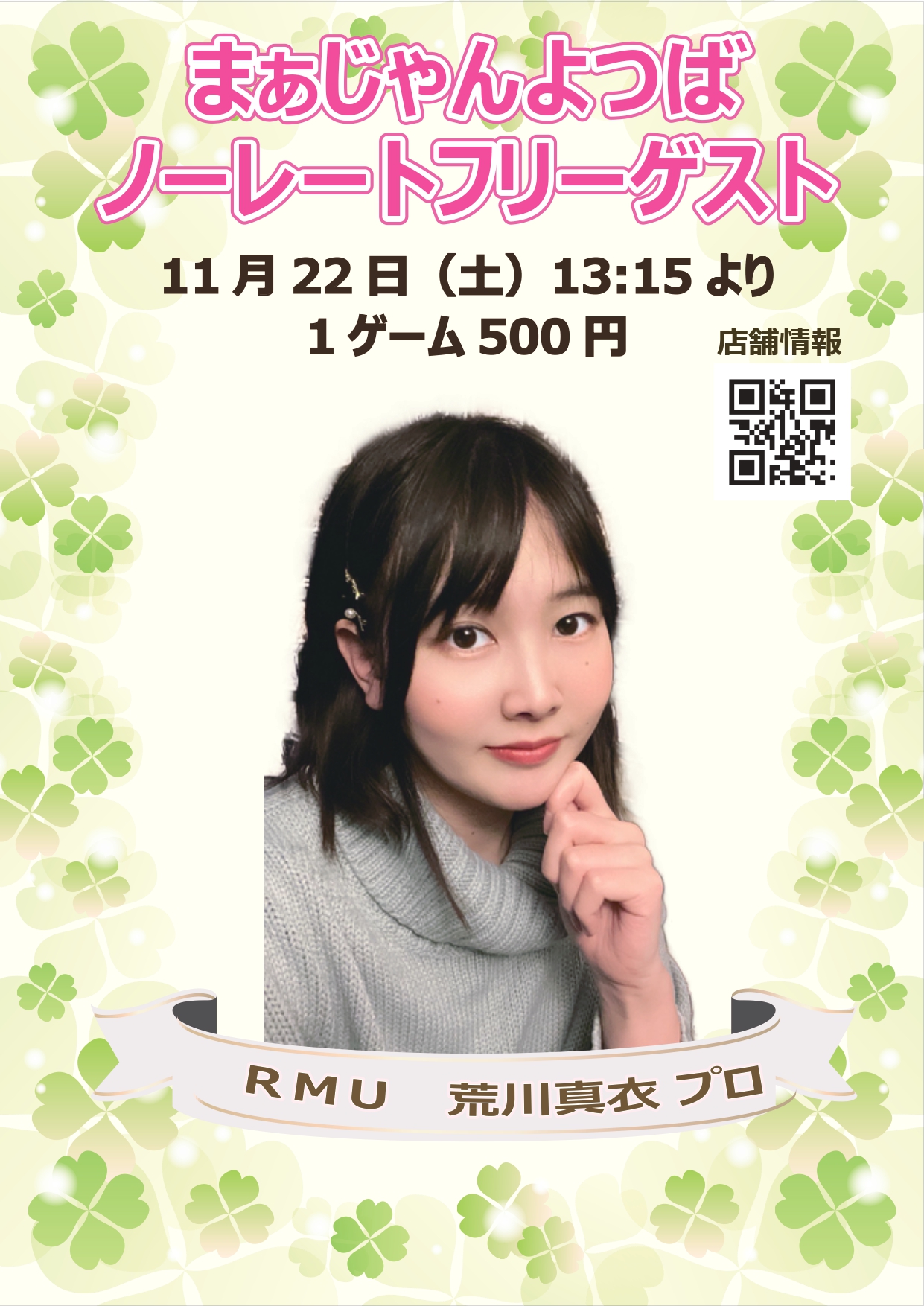まぁじゃん よつば神奈川県 マァジャン ヨツバ 神奈川県 本厚木駅 北口徒歩2分 セット、健康麻雀、麻雀教室、ノーレート 電話する046-225-9566 地図 店舗トップ ルール 写真/動画 イベント 求人 クーポン プロ イチオシ ランキング クチコミ イベント詳細 イベント マージャン101イン厚木開催中 固定イベント 毎月第2月曜にマージャン101イン厚木が開催されます。(17:30~22:00) 1G400円で、マージャン101初体験の方は無料でご参加頂けます。 詳しくは以下のURLからご確認ください。 ※2024年6月は第三月曜の開催となります。 http://www.101fed.com/ イベント GPC神奈川リーグ開催中です!! 日時 : 2025年12月6日(土)~2025年12月6日(土) 5月より始まりましたGPC神奈川リーグ。 次回は12/6(土)の開催です。 お申込み、お問い合わせなどは以下のURLからお願い致します。 https://goodplayersclub.com/accept/ イベント 麻将教室もやってます♪ 固定イベント 健康麻将教室とは・・・? 中高齢者向けの麻将教室(マージャン教室)です。 マージャン牌に触るのは初めて!といった方から 点数計算を覚えたい、ルールは覚えたけどなかなか ゲームに勝てないで悩んでいるといった方まで 幅広く対応しています。 また、教室を卒業した後でも、併設されている サークルで麻将を楽しむ事が出来ます。 お友達作り、頭の体操にぴったりの、健康麻将を 始めてみませんか? イベント RMU「荒川真衣プロ」来店 日時 : 2025年11月22日(土)~2025年11月22日(土) 11/22(土)にRMUの荒川真衣プロをゲストにお招きします。 13:15よりの開催となりますので、皆様のお越しをお待ちしております。 また、ゲスト卓は時間打ち切りとなりますので、ご了承ください。 さらに読み込む... 次の6件〜4件/全4件の検索 お店のコトを友達に教える Facebook X(旧Twitter) Line Mail お店を評価する 閉店・休業・移転・情報違い報告 クチコミ投稿 報告内容詳細※必須 閉店 休業 移転 情報違い 送信する