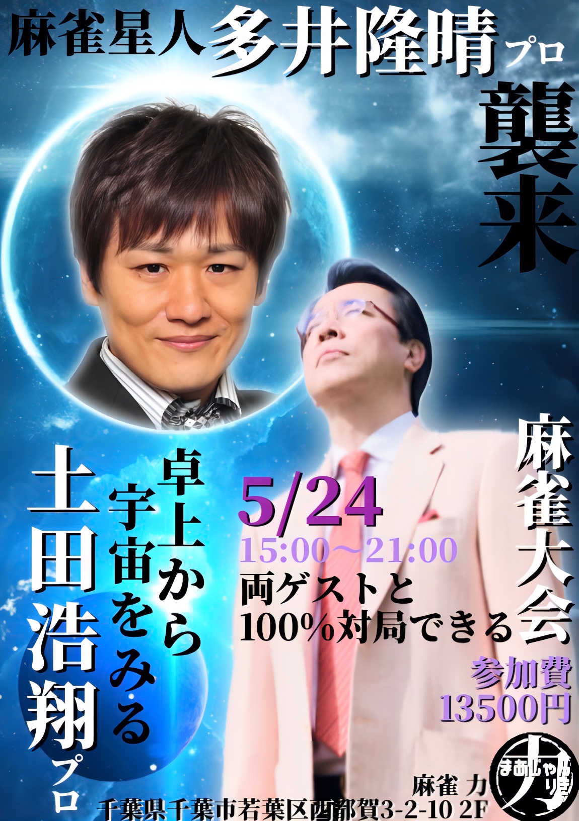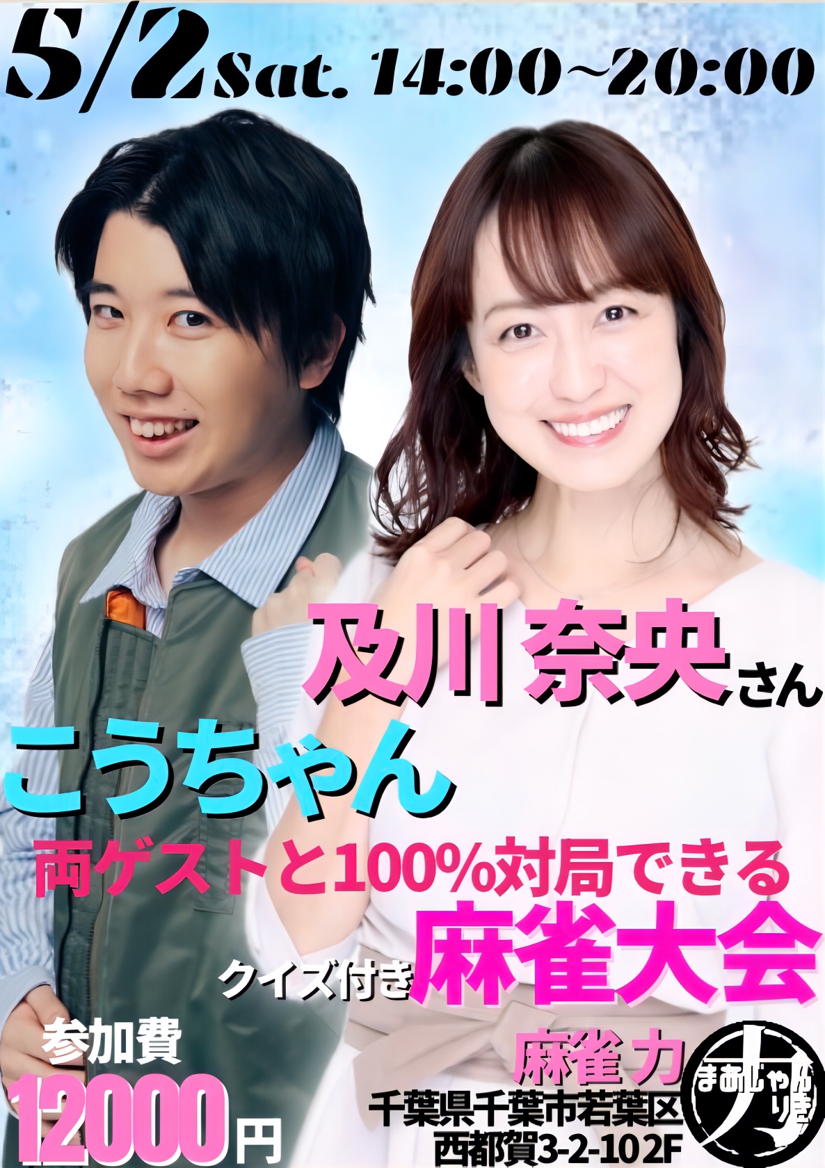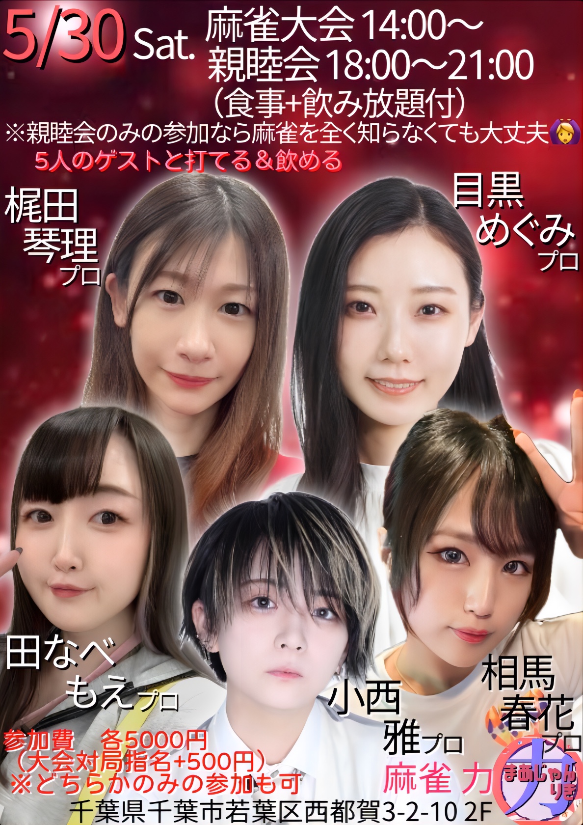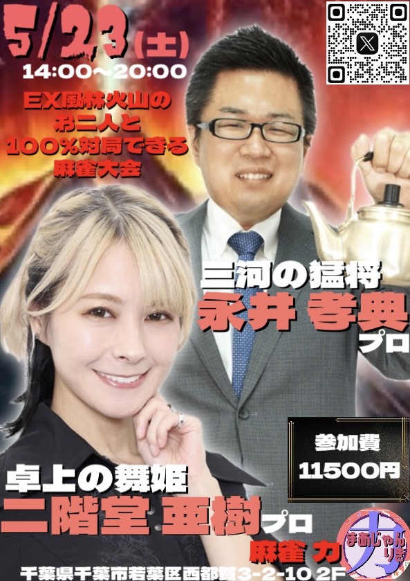 麻雀 力(りき)千葉県 マージャン リキ 千葉県 都賀駅 西口から徒歩30秒 ノーレート、フリー、セット、麻雀教室 電話する043-287-9944 地図 店舗トップ ルール 写真/動画 イベント 求人 クーポン プロ イチオシ ランキング クチコミ イベント詳細 イベント 最高位戦&協会の女流プロと打てる🀄飲める🥂親睦会付き麻雀大会🥳 日時 : 2026年5月30日(土)~2026年5月30日(土) 5月の親睦会付き麻雀大会は 最高位戦日本プロ麻雀協会より 小西雅 プロ 梶田琴理 プロ 日本プロ麻雀協会より 田なべもえ プロ 相馬春花 プロ 目黒めぐみ プロ がご来店! 麻雀大会のみ、親睦会のみの参加もOK! 親睦会のみは麻雀を知らなくても大丈夫! イベント 多井隆晴プロ&土田浩翔プロと100%対局できる麻雀大会🀄 日時 : 2026年5月24日(日)~2026年5月24日(日) 渋谷ABEMAS所属 多井隆晴プロ & Mリーグ解説 土田浩翔プロ がご来店! お二人と必ず同卓できます。 こちらのイベントは完売となっております。 イベント EX風林火山の亜樹監督&永井プロと100%対局できる麻雀大会🀄️ 日時 : 2026年5月23日(土)~2026年5月23日(土) EX風林火山 二階堂亜樹プロ 永井孝典プロ がご来店! お二人と必ず同卓できます。 こちらのイベントは完売となっております。 イベント セガサミーフェニックスのお二人と100%対局できる麻雀大会🀄️ 日時 : 2026年5月16日(土)~2026年5月16日(土) セガサミーフェニックス所属 醍醐大 プロ & 浅井堂岐 プロ がご来店! お二人と必ず同卓できます! イベント こうちゃん&及川奈央さんとクイズ付き麻雀大会🀄️ 日時 : 2026年5月2日(土)~2026年5月2日(土) 日本プロ麻雀連盟より こうちゃん プロ & 女優 及川奈央さん がご来店! クイズに正解してクイズポイントGET‼️ お二人と必ず同卓できます! さらに読み込む... 次の6件〜10件/全10件の検索 お店のコトを友達に教える Facebook X(旧Twitter) Line Mail お店を評価する 閉店・休業・移転・情報違い報告 クチコミ投稿 報告内容詳細※必須 閉店 休業 移転 情報違い 送信する