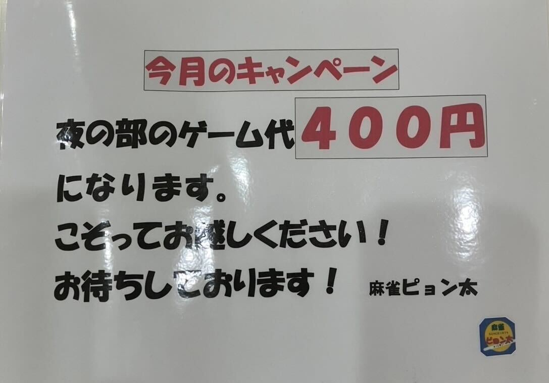 川崎麻雀 ピョン太神奈川県 カワサキマージャン ピョンタ 神奈川県 川崎駅 駅より徒歩1分 フリー、セット 電話する044-245-2220 地図 店舗トップ ルール 写真/動画 イベント 求人 クーポン プロ イチオシ ランキング クチコミ イベント詳細 イベント ピョン太限定ビンゴイベント!!! 固定イベント フリー限定!麻雀ピョン太ビンゴイベント!!!! 数ある役の中から役をあがると、特別でビックな景品をプレゼント!! (役満、役満放銃、二盃口、三色同刻、etc…) 1つ→1ゲームサービス券 ビンゴ1ライン→豪華特典 最後の一つを消すと、さらにBIGな特典が!!!!! 皆さんぜひ頑張ってください! イベント ✨今月のキャンペーン✨ 日時 : 2025年2月1日(土)~2025年2月28日(金) 夜の部のゲーム代を『400円』にさせていただきます! 皆様のご来店をお待ちしております(^^)/ イベント 毎週火曜日、日曜日はレディースデイ✨ 日時 : 2025年2月1日(土)~2025年12月31日(水) ご好評につき復活!!! 毎週火曜日、日曜日は女性のお客様はフリーゲーム代を『半額』とさせていただきます(*´ω`*) ご来店をお待ちしております(^^)/ さらに読み込む... 次の6件〜3件/全3件の検索 お店のコトを友達に教える Facebook X(旧Twitter) Line Mail お店を評価する 閉店・休業・移転・情報違い報告 クチコミ投稿 報告内容詳細※必須 閉店 休業 移転 情報違い 送信する