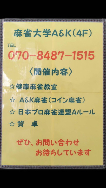 麻雀大学 A&K愛知県 マージャンダイガク エーアンドケー 愛知県 池下駅 徒歩1分 四麻、ノーレート、その他、麻雀教室、健康麻雀、セット 電話する070-8487-1515 地図 店舗トップ ルール 写真/動画 イベント 求人 クーポン プロ イチオシ ランキング クチコミ 写真一覧 動画一覧 お店のコトを友達に教える Facebook X(旧Twitter) Line Mail お店を評価する 閉店・休業・移転・情報違い報告 クチコミ投稿 報告内容詳細※必須 閉店 休業 移転 情報違い 送信する