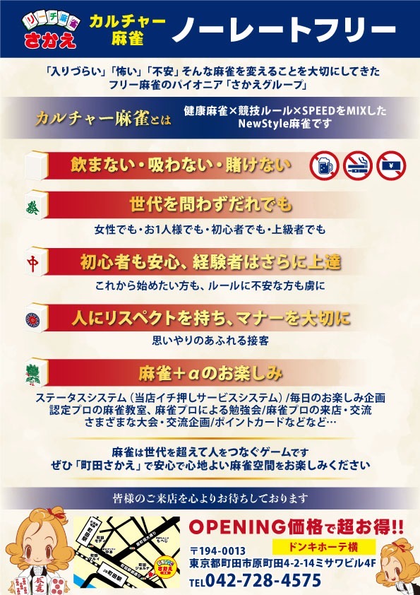町田さかえ東京都 マチダサカエ 東京都 町田駅 徒歩3分 四麻、フリー、セット、三麻 電話する042-728-4575 地図 店舗トップ ルール 写真/動画 イベント 求人 クーポン プロ イチオシ ランキング クチコミ イチオシ詳細 スポットライトイチオシ イチオシ 1 🀄カルチャー麻雀🀄【ノーレートフリー】 安心して遊べるお店です!!✨ オープニング記念で回数券がお得に!! お友達紹介キャンペーン実施中❣ イチオシ 2 驚きの低価格❗️ イチオシ 3 タイムサービス🥞💓 お店のコトを友達に教える Facebook X(旧Twitter) Line Mail お店を評価する 閉店・休業・移転・情報違い報告 クチコミ投稿 報告内容詳細※必須 閉店 休業 移転 情報違い 送信する