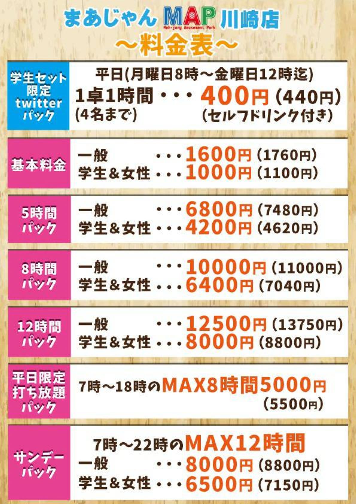 まぁじゃんMAP 川崎本店神奈川県 マァジャンマップ カワサキホンテン 神奈川県 川崎駅 徒歩4分 四麻、三麻、セット、フリー 電話する044-211-8058 地図 店舗トップ ルール 写真/動画 イベント 求人 クーポン プロ イチオシ ランキング クチコミ イチオシ詳細 スポットライトイチオシ イチオシ 1 公式LINEから簡単予約! 公式LINEを友だち登録していただくと セットのご予約が簡単に出来ちゃいます★ お得なクーポン・ショップカードも配信中❤ ショップカードのスタンプを来店時にGET!! 10個貯める毎にクーポン貰える!! 50個貯めると、 「4000遊pt or セット料金20%割引券」 イチオシ 2 とってもお得なパック料金 遊べば遊ぶほどお得なパックを多数用意! ◯平日限定打ち放題パック 平日 10:00-18:00 ¥5000-(税抜) ※最大8時間まで ◯サンデーパック 日曜日 7:00~22:00 ¥8000-(税抜) ◯5Hパック 一般様¥6800-(税抜) 学生&女性¥4200-(税抜) ※土日祝日は8時間未満の女性学生料金は適応出来ません。 ◯8Hパック 一般様¥10000-(税抜) 学生&女性¥6400-(税抜) ◯12Hパック 一般様¥12500-(税抜) 学生&女性¥8000-(税抜) お店のコトを友達に教える Facebook X(旧Twitter) Line Mail お店を評価する 閉店・休業・移転・情報違い報告 クチコミ投稿 報告内容詳細※必須 閉店 休業 移転 情報違い 送信する