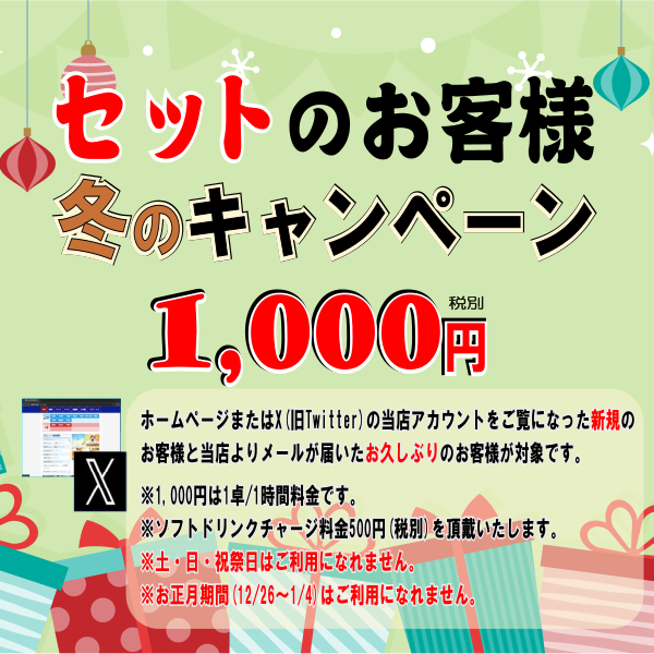 麻雀 CABO(カボ) 川崎店神奈川県 マージャン カボ カワサキテン 神奈川県 川崎駅 東口 徒歩5分 四麻、フリー、セット 電話する044-222-6228 地図 店舗トップ ルール 写真/動画 イベント 求人 クーポン プロ イチオシ ランキング クチコミ イチオシ詳細 スポットライトイチオシ イチオシ 1 ■「頂」ポイントスタート! これまでのポイントカードに変わり、 「麻雀の頂」のポイントカードがスタートしました! ・来店 5P ・打数 2P ・ご新規様サービス 1回目の来店 1000P 2回目の来店 1000P 3回目の来店 1000P 合計3000Pをサービス! さらに一の位に3のつく日はポイント倍! ※「麻雀の頂」カードをお持ちのお客様は、4月1日以降の来店P、打数Pが自動に付与されます。 イチオシ 3 秋のセット・キャンペーン ☆冬のキャンペーン 対象:新規・お久しぶりのセット様 1,000円(税込1,100円) 1卓 / 1時間 ※ソフトドリンク・一日チャージ料金550円(税込) を頂戴しています。 ※土・日・祝日はご利用になれません。 ※お正月期間はご利用になれません。 お店のコトを友達に教える Facebook X(旧Twitter) Line Mail お店を評価する 閉店・休業・移転・情報違い報告 クチコミ投稿 報告内容詳細※必須 閉店 休業 移転 情報違い 送信する