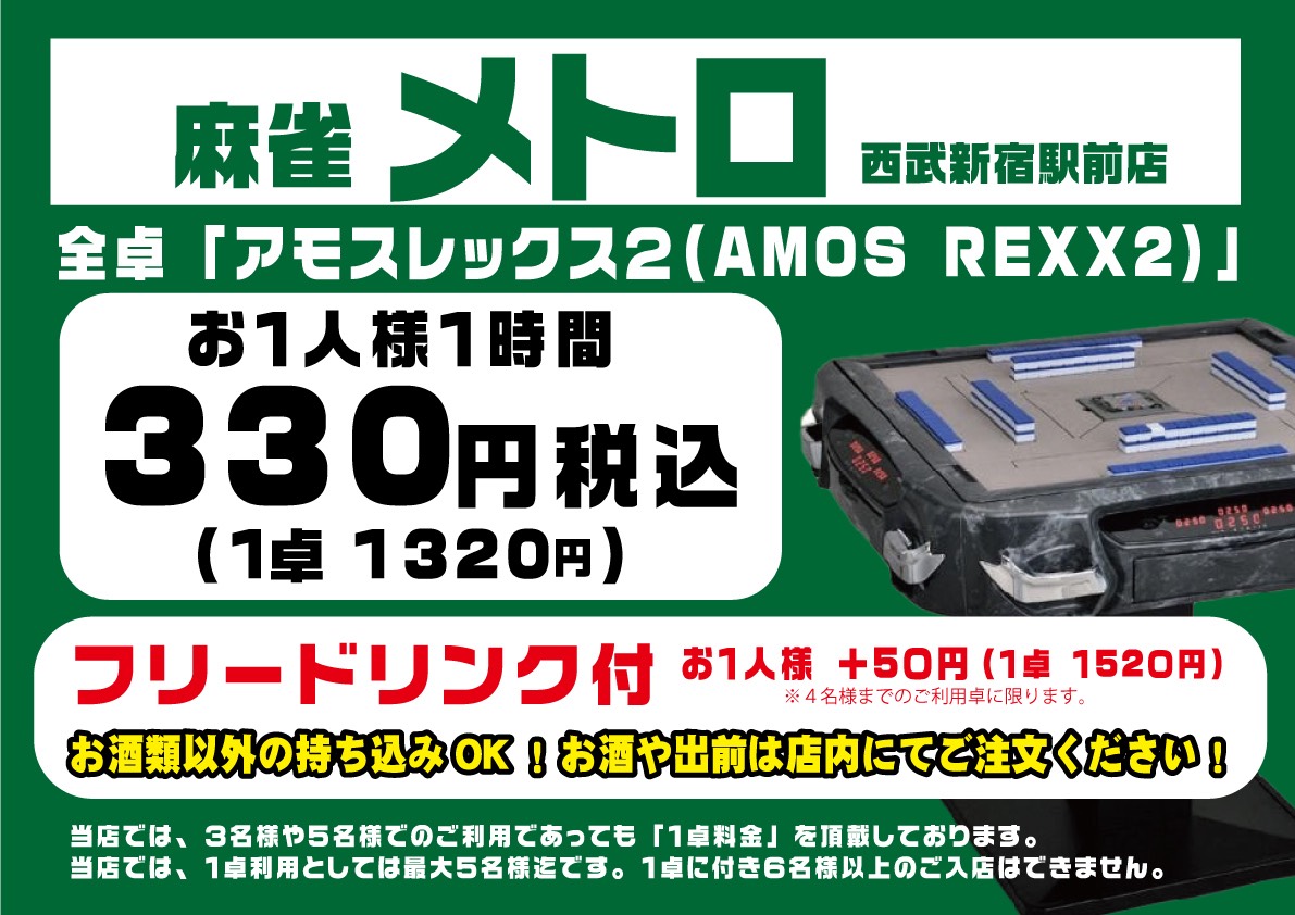 麻雀メトロ 西武新宿駅前店東京都 マージャンメトロ セイブシンジュクエキマエテン 東京都 西武新宿駅 徒歩30秒 四麻、三麻、セット 電話する03-6457-3211 地図 店舗トップ ルール 写真/動画 イベント 求人 クーポン プロ イチオシ ランキング クチコミ 総合 麻雀メトロ 西武新宿駅前店 3.0 5 1 ? 点数について 1件 詳細 雀荘クチコミの点数概要 クチコミの点数は、総合点数を中心に、全部で11項目あります。 12項目は「雀荘の営業形態についての項目」と「その他の環境についての項目」の2つにわかれます。 総合スコア (計11項目) 営業形態点数 (6項目) 雀荘の営業形態についての点数 フリー セット 健康麻雀 麻雀教室 ノーレート 三麻 その他の環境点数 (5項目) 雀荘の設備、その他の環境についての点数 設備 接客 居心地 CP(コストパフォーマンス)・清潔感 ※麻雀王国雀荘検索のクチコミの点数は、当社独自の基準に基づく評価であり、雀荘の価値を何ら保証するものではあ りません。あくまでの一つの参考としてご活用ください。 雀荘クチコミ点数の算出方法要 クチコミの点数は、「ユーザー評価」に独自のアルゴリズムで掛け合わせて算出しております。 麻雀王国では、日々信頼性の高い点数を追及し、微調整を行っております。 ユーザー評価 個人が付けた点数 (雰囲気、感性、感覚、状況、主観など) フリー- セット3.0 健康麻雀- 麻雀教室- ノーレート- 三麻3.0 設備 3.0 | 接客 3.0 | 居心地 3.0 | CP(コストパフォーマンス) 3.0 | 清潔感 3.0 セット ¥330/般 メトログループ 長期契約安心店舗 全国74位 東京都* 【東京都新宿区・西武新宿駅】麻雀メトロ 西武新宿駅前店は、四麻・三麻・セットが楽しめる雀荘です。 🀄セット専門店🀄 お1人様 ¥330(1卓1時間¥1,320)フリードリンク無し お1人様 ¥380(1卓1時間¥1,520)フリードリンク付 ※土日祝料金・特別料金等は頂いておりません。 平日の8時~14時までは1時間1卓4名様¥1,000でご利用できます。 (30分¥500) 特別営業の為、クレジット決済または電子マネー決済のみのご利用となります。 ※現金でのご利用は出来ません。 ※各種サービスはございません。 ※他の割引サービスとの併用は出来ません。(新規半額のご利用は出来ません。) ゲーム代半額キャンペーン中!『1卓1時間660円』 □┓ 麻雀メトロ 西武新宿駅前店・市川店イベント ┗┛━…‥‥…━…‥‥…━…‥‥… ★━┳━┳━┳━┳━┓ ┃新┃規┃限┃定┃☆┃ ┣━┻━┻━┻━┻━★ 《月~木限定》※祝前日・金土日祝日は除く 【キャンペーン価格】 配牌卓1卓1時間660円!(通常1,320円) ご利用時間の制限無し! この機会にぜひ麻雀メトロをお試しください。 スタッフ一同皆様のご来店をお待ちしております。 【ご利用にあたって】 1.店舗を始めてご利用の際に限ります。 2.下記に記載の合言葉をご来店時にスタッフお伝えください。 3.お名前とお電話番号を控えさせていただきます。 4.お名前を確認できる身分証等を確認させていただきます。 5.他の割引サービス等との併用は不可とさせていただきます。 6.来店時に必ずもう一度スタッフに新規割とお伝えください。 ※上記1~6項目を行わなかった場合、新規割引は適用されません。 合言葉は「王国」です♪ ※予告無く内容が変更又は終了となる場合がございますので、詳しくはスタッフ又はお電話にてお問い合わせくださいますようお願いいたします。 御予約は受付ておりませんので、当日スタッフにお知らせくださいますようお願いいたします。 強力換気で営業しております!! クレジット・交通系IC決算を導入いたしました。 メトロプラザ6ビルの建物内にエレベーター完備! ウォシュレット、大型テレビ2台完備。 ひざ掛け、携帯充電ケーブルのご用意ございます。 ※平日のお問合せは14時以降でお願いいたします。 全日フリードリンク付きで、 1時間¥380(1卓¥1,520)でご利用頂けます!! ※クレジット決済・電子マネー決済可(出前は不可) 《フリードリンクメニュー》 COLD:コカ・コーラ/スプライト/アイスコーヒー アイスティー/烏龍茶/ジャスミン茶 HOT:コーヒー/レモンティー/ココア/緑茶 ※飲み物はお席までお持ち致します。 《有料ソフトドリンク》 コカ・コーラ各種¥250 ミルクココア・ブルーベリー・充実野菜 各種¥150 レッドブル ¥300 《アルコール》各種¥500 瓶ビール(¥600)ハイボール、レモンサワー ウーロンハイ、ウイスキー(ロック、水、ソーダ) 黒霧島・いいちこ(ロック、水、ソーダ) 持ち込み有(※アルコール類は除く)で安心! ただいま会員募集中です! 続きを見る 閉じる お店のイチオシポイント イチオシ 1 +50円でフリードリンク付き!駅を降りて目の前のビルです! 【飲み放題メニュー】コカ・コーラ スプライト/アイスコーヒー アイスティー/ホットコーヒー 烏龍茶/ジャスミン茶/ホットレモンティー ホットココア/温かい緑茶 アルコール類以外の持ち込み可!! イチオシ 2 お得な会員カード発行中 来店時に1ポイント50円、10ポイント貯めて500円の割引サービスをいたします。 ※1ポ