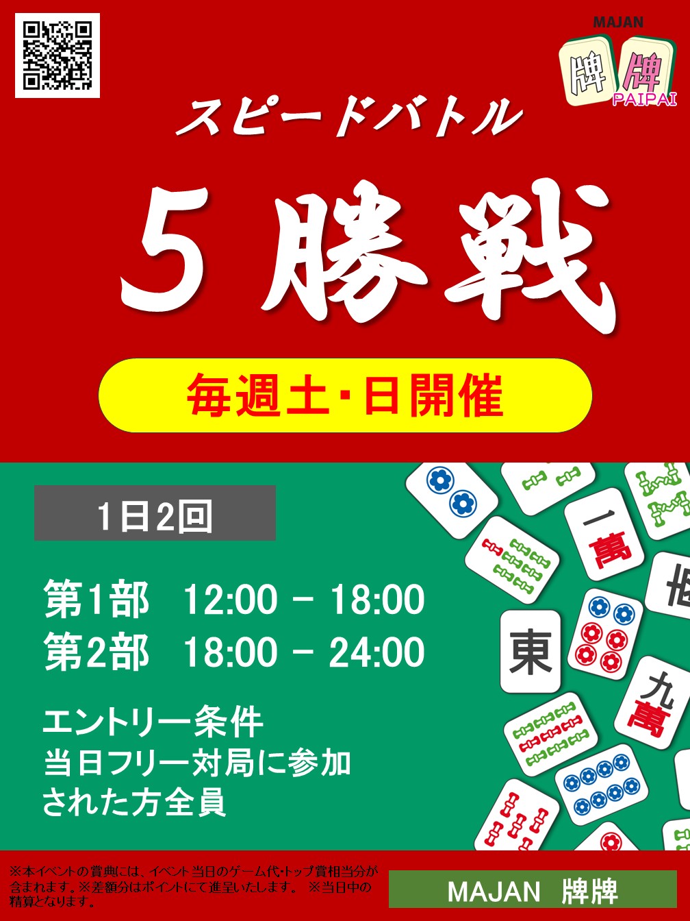 MAJAN 牌牌福岡県 マージャンパイパイ 福岡県 天神南駅 6番出口より徒歩2分 四麻、セット、フリー 電話する092-406-8244 地図 店舗トップ ルール 写真/動画 イベント 求人 クーポン プロ イチオシ ランキング クチコミ 総合 MAJAN 牌牌 - 5 0 ? 点数について 0件 詳細 雀荘クチコミの点数概要 クチコミの点数は、総合点数を中心に、全部で11項目あります。 12項目は「雀荘の営業形態についての項目」と「その他の環境についての項目」の2つにわかれます。 総合スコア (計11項目) 営業形態点数 (6項目) 雀荘の営業形態についての点数 フリー セット 健康麻雀 麻雀教室 ノーレート 三麻 その他の環境点数 (5項目) 雀荘の設備、その他の環境についての点数 設備 接客 居心地 CP(コストパフォーマンス)・清潔感 ※麻雀王国雀荘検索のクチコミの点数は、当社独自の基準に基づく評価であり、雀荘の価値を何ら保証するものではあ りません。あくまでの一つの参考としてご活用ください。 雀荘クチコミ点数の算出方法要 クチコミの点数は、「ユーザー評価」に独自のアルゴリズムで掛け合わせて算出しております。 麻雀王国では、日々信頼性の高い点数を追及し、微調整を行っております。 ユーザー評価 個人が付けた点数 (雰囲気、感性、感覚、状況、主観など) フリー- セット- 健康麻雀- 麻雀教室- ノーレート- 三麻- 設備 - | 接客 - | 居心地 - | CP(コストパフォーマンス) - | 清潔感 - フリー ¥400/般 セット ¥300/般 全国* 福岡県1位 【福岡県福岡市中央区・天神南駅】MAJAN 牌牌は、四麻・セット・フリーが楽しめる雀荘です。 天神南駅6番出口より徒歩2分🚉 福岡市ではここだけ‼ 4人打ちの条件付き東南戦(スピードバトル)のお店です🀄 8月30日(土)から皆様に楽しんでいただけるようにルール変更✨️✨️ 詳しくは、”イチオシ”をご覧ください☺️♪ 只今激アツのイベント5勝戦を毎週土日のみ 1日2回開催中! 1部 12:00〜18:00 2部 18:00〜24:00 Mリーグでも採用されている最新卓『AMOS REXXⅢ』導入!!! 分煙(電子タバコ可)のキレイな店内でご遊戯いただけます(^^)/ 天神エリアで麻雀をされる際は、『MAJAN 牌牌』へ☆ 皆様のご来店をお待ちしております♪ ---- セットのご予約について---- 一般価格:1,200円/1卓1時間 会員価格:1,000円/1卓1時間 ※持ち込み完全自由 ※営業時間外をご希望の場合はご相談ください セットのご予約は公式LINEより24時間受け付けております。 LINE ID→@451erhvq *セット料金は3時間からとなります。 ◆◆◆◆◆◆◆◆◆◆◆◆◆◆◆◆◆◆◆ ・フリードリンク ・女性専用トイレ ・大型テレビ ・スマホ、携帯充電可 続きを見る 閉じる お店のイチオシポイント イチオシ 1 ✨毎週開催 激アツイベント✨ 土日開催⭐️5勝戦⭐️ 1日2回開催 1部 12:00〜18:00 2部 18:00〜24:00 イチオシ 2 タクシーサービス イチオシ 3 セット会員募集中✨️ お店のコトを友達に教える Facebook X(旧Twitter) Line Mail お店を評価する 閉店・休業・移転・情報違い報告 クチコミ投稿 報告内容詳細※必須 閉店 休業 移転 情報違い 送信する 「ネット予約」&「チェックイン」で 来店人数×100Gもらえる! ログイン ご予約情報入力 来店日※ 2013年12月31日(火) 卓数※ 12345678910卓 予定開始※ 1:00 2:00 3:00 4:00 5:00 6:00 7:00 8:00 9:00 10:00 11:00 12:00 13:00 14:00 15:00 16:00 17:00 18:00 19:00 20:00 21:00 22:00 23:00 24:00 予定終了※ 1:00 2:00 3:00 4:00 5:00 6:00 7:00 8:00 9:00 10:00 11:00 12:00 13:00 14:00 15:00 16:00 17:00 18:00 19:00 20:00 21:00 22:00 23:00 24:00 お名前※ 携帯TEL※ メール※ ルール※ 四麻 三麻 点数※ 25000点 30000点 赤枚数※ 赤5マン01234 赤5ピン01234 赤5ソー01234 その他 チップ 焼鳥 備考 予約する クチコミ 投稿する お店独自のHP・ソーシャル X (旧twitter) Instagram お店の情報詳細 店名 MAJAN 牌牌 住所 〒810-0003 [地図] 福岡県福岡市中央区春吉3丁目21-21 春野ビル4階 電話 092-406-8244 交通手段 福岡市営地下鉄七隈線 天神南駅 6番出口より徒歩2分 福岡市営地下鉄空港線 天神駅 徒歩5分 国体道路沿い 吉野家の入っているビル4F 営業時間 14:00~24:00 [平日14時00分より 木曜日定休日] 11:00~24:00 [土日祝日11時00分より] 定休日 木 営業内容 四麻、セット、フリー ゲーム代(フリー) ¥400/般 [東風戦/1回] ゲーム代(セット) ¥300/般 [【通常価格】1卓1200円/1時間 【会員価格】1卓1000円/1時間 ] ゲーム代(健康麻雀) ゲーム代(麻雀教室) その他の料金 オープン日 2024年7月6日 お店のサービス・システム・設備 総卓数 5卓 卓種 全自動配牌卓×5 サービス フリードリンク、自動配牌卓、女性スタッフ システム・設備 大型TV、ウォシュレット、女性専用トイレ 備考 関連エリア・路線 福岡県の雀荘ランキング 天神南駅の雀荘ランキング 天神駅の雀荘ランキング 福岡県の雀荘特集 福岡県福岡市中央区の雀荘特集 天神南駅の雀荘特集 天神駅の雀荘特集 お店を利用する 電話する092-406-8244 地図福岡県福岡市中央区春吉3丁目21-21春野ビル4階 [ 管理者ページ ]