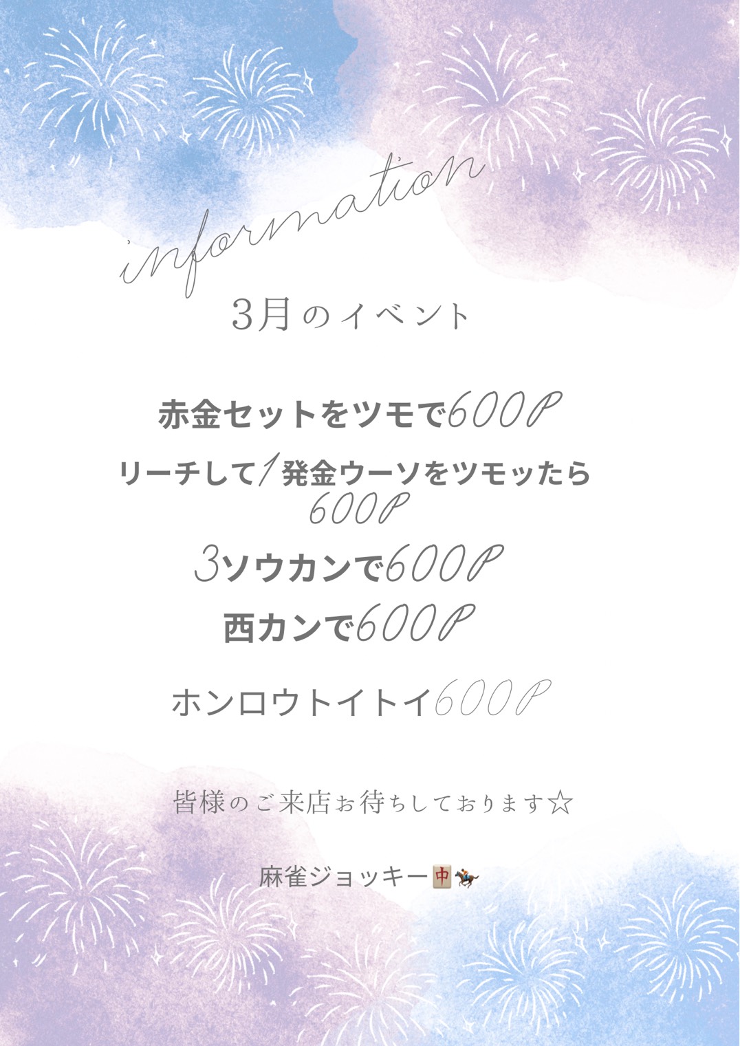 麻雀 ジョッキー神奈川県 マージャンジョッキー 神奈川県 関内駅 徒歩9分 四麻、三麻、麻雀教室、セット、フリー 電話する045-273-2692 地図 店舗トップ ルール 写真/動画 イベント 求人 クーポン プロ イチオシ ランキング クチコミ 総合 麻雀 ジョッキー 3.0 5 2 ? 点数について 2件 詳細 雀荘クチコミの点数概要 クチコミの点数は、総合点数を中心に、全部で11項目あります。 12項目は「雀荘の営業形態についての項目」と「その他の環境についての項目」の2つにわかれます。 総合スコア (計11項目) 営業形態点数 (6項目) 雀荘の営業形態についての点数 フリー セット 健康麻雀 麻雀教室 ノーレート 三麻 その他の環境点数 (5項目) 雀荘の設備、その他の環境についての点数 設備 接客 居心地 CP(コストパフォーマンス)・清潔感 ※麻雀王国雀荘検索のクチコミの点数は、当社独自の基準に基づく評価であり、雀荘の価値を何ら保証するものではあ りません。あくまでの一つの参考としてご活用ください。 雀荘クチコミ点数の算出方法要 クチコミの点数は、「ユーザー評価」に独自のアルゴリズムで掛け合わせて算出しております。 麻雀王国では、日々信頼性の高い点数を追及し、微調整を行っております。 ユーザー評価 個人が付けた点数 (雰囲気、感性、感覚、状況、主観など) フリー3.0 セット3.0 健康麻雀3.0 麻雀教室3.0 ノーレート3.0 三麻3.0 設備 3.0 | 接客 3.0 | 居心地 3.0 | CP(コストパフォーマンス) 3.0 | 清潔感 3.0 フリー ¥600/般 セット ¥300/般 ¥250/学 全国* 神奈川県32位 【神奈川県横浜市中区・関内駅】麻雀 ジョッキーは、四麻・三麻・麻雀教室・セット・フリーが楽しめる雀荘です。 ~ご来店の皆様へ~ 当店が明日8/23で1周年を迎えます✨ 1周年を記念して、明日からイベントを開催します(^^)/ 大(小)四喜を出した方に、お店より豪華特典アリ♪ 喫煙可能店舗です!! (ご連絡) 1周年記念イベント✨ 女性のお客様限定、 フリーで来店の方、 1ゲーム無料キャンペーンを はじめました🀄️ ご来店お待ちしております🙇♀️ 皆様のご来店・チャレンジをお待ちしております(*´ω`*) 関内駅徒歩9分さらに 伊勢佐木長者町駅から徒歩2分の超好立地!! 夫婦で営業しているアットホームなお店です(*´ω`*) 初心者の方、女性の方大歓迎です。 ⭐︎ただ今キャンペーン開催中⭐︎ セットのお客様 5時間パック:5,000円‼️ ※(年末年始、ゴールデンウィーク、お盆は除く) (尚、ドリンクサービスはございませんので、ドリンクのご持参よろしくお願いします。) お電話で”5時間パック希望”と お伝えください。 ご来店お待ちしております♪ オリジナル牌金ウーピン導入!! 金ウーピンに関するイベント多数 イベントページをチェック 様々な飲み物が無料やポイントカードなどサービス盛りだくさん。 今なら麻雀王国を見たと伝えてくだされば1ゲームサービス中! ・ドリンク無料 ・大型TV ・空気清浄機 ・Wi-Fi完備 続きを見る 閉じる お店のイチオシポイント イチオシ 1 ドリンク無料! オロナミンCやサイダー、デカビタがあります。 無くなり次第終了です イチオシ 2 ポイントカード お店のコトを友達に教える Facebook X(旧Twitter) Line Mail お店を評価する 閉店・休業・移転・情報違い報告 クチコミ投稿 報告内容詳細※必須 閉店 休業 移転 情報違い 送信する 最新情報 2026年3月4日(水) イベント 毎月変わるお得イベント✨ 今月のイベントはこちら! ぜひチャレンジしてください(^^)/ 「ネット予約」&「チェックイン」で 来店人数×100Gもらえる! ログイン ご予約情報入力 来店日※ 2013年12月31日(火) 卓数※ 12345678910卓 予定開始※ 1:00 2:00 3:00 4:00 5:00 6:00 7:00 8:00 9:00 10:00 11:00 12:00 13:00 14:00 15:00 16:00 17:00 18:00 19:00 20:00 21:00 22:00 23:00 24:00 予定終了※ 1:00 2:00 3:00 4:00 5:00 6:00 7:00 8:00 9:00 10:00 11:00 12:00 13:00 14:00 15:00 16:00 17:00 18:00 19:00 20:00 21:00 22:00 23:00 24:00 お名前※ 携帯TEL※ メール※ ルール※ 四麻 三麻 点数※ 25000点 30000点 赤枚数※ 赤5マン01234 赤5ピン01234 赤5ソー01234 その他 チップ 焼鳥 備考 予約する クチコミ 投稿する 麻雀 ジョッキー 神奈川県 関内駅 穴場、良店です。 2025/12/23 (2025/12訪問) ゲスト さんのクチコミ 総合 4.0 麻雀 ジョッキー 神奈川県 関内駅 新しくて良い店です。 2025/10/08 (2025/10訪問) ゲスト さんのクチコミ 総合 4.0 お店独自のHP・ソーシャル X (旧twitter) Instagram お店の情報詳細 店名 麻雀 ジョッキー 住所 〒231-0057 [地図] 神奈川県横浜市中区曙町1-9 上田ビル3F 電話 045-273-2692 交通手段 JR京浜東北線 関内駅 徒歩9分 ブルーライン 伊勢佐木長者町駅 徒歩2分 営業時間 9:00~24:30 定休日 年中無休 営業内容 四麻、三麻、麻雀教室、セット、フリー ゲーム代(フリー) ¥600/般 [東南戦] ¥400/般 [東南戦] ゲーム代(セット) ¥300/般 ¥250/学 [女性割250円] ゲーム代(健康麻雀) ゲーム代(麻雀教室) ¥3,000/般 [要予約ドリンク付き] その他の料金 オープン日 2024年8月23日 初投稿者 ゲスト お店のサービス・システム・設備 総卓数 4卓 卓種 全自動配牌卓×4 サービス フリードリンク、自動配牌卓
