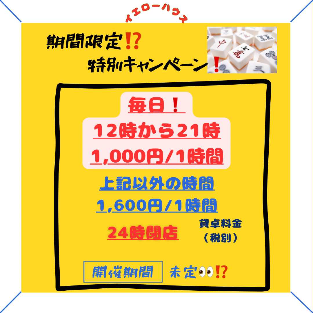 イエローハウス愛知県 イエローハウス 愛知県 豊田市駅 徒歩15分 ノーレート、健康麻雀、セット、フリー 電話する0565-31-3747 地図 店舗トップ ルール 写真/動画 イベント 求人 クーポン プロ イチオシ ランキング クチコミ 総合 イエローハウス 3.0 5 5 ? 点数について 5件 詳細 雀荘クチコミの点数概要 クチコミの点数は、総合点数を中心に、全部で11項目あります。 12項目は「雀荘の営業形態についての項目」と「その他の環境についての項目」の2つにわかれます。 総合スコア (計11項目) 営業形態点数 (6項目) 雀荘の営業形態についての点数 フリー セット 健康麻雀 麻雀教室 ノーレート 三麻 その他の環境点数 (5項目) 雀荘の設備、その他の環境についての点数 設備 接客 居心地 CP(コストパフォーマンス)・清潔感 ※麻雀王国雀荘検索のクチコミの点数は、当社独自の基準に基づく評価であり、雀荘の価値を何ら保証するものではあ りません。あくまでの一つの参考としてご活用ください。 雀荘クチコミ点数の算出方法要 クチコミの点数は、「ユーザー評価」に独自のアルゴリズムで掛け合わせて算出しております。 麻雀王国では、日々信頼性の高い点数を追及し、微調整を行っております。 ユーザー評価 個人が付けた点数 (雰囲気、感性、感覚、状況、主観など) フリー- セット3.0 健康麻雀3.0 麻雀教室3.0 ノーレート- 三麻- 設備 3.0 | 接客 3.0 | 居心地 3.0 | CP(コストパフォーマンス) 3.0 | 清潔感 3.0 フリー ¥400/般 セット ¥1,000/般 ¥1,000/学 長期契約安心店舗 全国* 愛知県25位 【愛知県豊田市・豊田市駅】イエローハウスは、ノーレート・健康麻雀・セット・フリーが楽しめる雀荘です。 ☆貸卓 激安 貸卓 1000円/一時間 12時→21時 上記以外は1600円/一時間 基本10時開店 24時閉店 @貸卓税別 (月曜日 水曜日は定休日) ノーレート麻雀(健康麻雀)開催中 一時間400円 お一人様歓迎 女性歓迎 火・木・金・土・日 12時スタート→MAX20時 0565-31-3747 お問合せ 【貸卓 】 ☆貸卓キャンペーン 12時→21時 1000円/一時間(税別) 18時まで完全禁煙に協力していただいてます 18時以後は電子タバコのみ可能 喫煙エリアあります 【健康麻雀】 12時→18時 MAX20時 1時間 400円(税込)お一人様 (15分 100円) *小学生 200円/H *中高生 300円/H 保護者同伴必須 ドリンク 食事持込🆗 ノーレートのお遊びフリー雀荘です。初心者から経験者まで大歓迎。お一人様でご参加🆗 麻雀経験レベルに合わせての組合せでゲームを楽しむことができます。女性や若者も大勢ご来店されてますので麻雀荘ご来店が初めての方も安心してご参加できます。見学🆗 体験🆗 ポイントレース、役満競争など各種イベント開催中。 初回ご来店の方は割引サービス券を配布してます。またご紹介者の方にも割引サービス券を配布します。 【営業時間】 ☆貸卓 10時→24時(基本12時オープン) @月曜日 水曜日は定休日 予約に限り朝よりオープンしますのでご連絡ください 📞0565-31-3747 ※飲食アルコール持ち込み🆗 ☆健康麻雀(ノーレート) 開催日 火 木 金 土 日 12時スタートMAX20時 【貸卓料金】 12時→21時 1000円/一時間 上記以外の時間帯 1600円/一時間 (特別営業日 12時→18時) 24時閉店 @貸卓税別 自動配牌卓を多数設置しておりますので、快適に麻雀をお楽しみ頂けます。 空気清浄機・男女別トイレあり また30台分の無料駐車場もご用意しておりますので お車でもお気軽にご来店頂けます。 豊田で麻雀でお遊びの際は、清潔で明るい麻雀倶楽部 イエローハウスへお越し下さい♪♪ 従業員一同お待ちしております。 続きを見る 閉じる お店のイチオシポイント イチオシ 1 貸卓 1000円/一時間より 貸卓激安 ノーレート麻雀 イチオシ 2 フリー麻雀 健康麻雀 ノーレート健康麻雀🀄️ 【健康麻雀】 火曜日 木曜日 金曜日 土曜日 日曜日 12時スタート @MAX20時まで 100円/15分 400円/H(税込) お一人様歓迎 初心者歓迎 女性歓迎 飲食持ち込み🆗 禁煙 禁酒 イチオシ 3 明るい店内 空気清浄機あり 🅿︎ 30台完備 全11卓 自動配牌 5台 お店のコトを友達に教える Facebook X(旧Twitter) Line Mail お店を評価する 閉店・休業・移転・情報違い報告 クチコミ投稿 報告内容詳細※必須 閉店 休業 移転 情報違い 送信する 「ネット予約」&「チェックイン」で 来店人数×100Gもらえる! ログイン ご予約情報入力 来店日※ 2013年12月31日(火) 卓数※ 12345678910卓 予定開始※ 1:00 2:00 3:00 4:00 5:00 6:00 7:00 8:00 9:00 10:00 11:00 12:00 13:00 14:00 15:00 16:00 17:00 18:00 19:00 20:00 21:00 22:00 23:00 24:00 予定終了※ 1:00 2:00 3:00 4:00 5:00 6:00 7:00 8:00 9:00 10:00 11:00 12:00 13:00 14:00 15:00 16:00 17:00 18:00 19:00 20:00 21:00 22:00 23:00 24:00 お名前※ 携帯TEL※ メール※ ルール※ 四麻 三麻 点数※ 25000点 30000点 赤枚数※ 赤5マン01234 赤5ピン01234 赤5ソー01234 その他 チップ 焼鳥 備考 予約する クチコミ 投稿する イエローハウス 愛知県 豊田市駅 健康麻雀やるならここですネ。 2024/08/28 (2024/07訪問) ゲスト さんのクチコミ 総合 5.0 イエローハウス 愛知県 豊田市駅 丁寧で明るい接客が◎女性も安心して入れます!お客さんも良い方