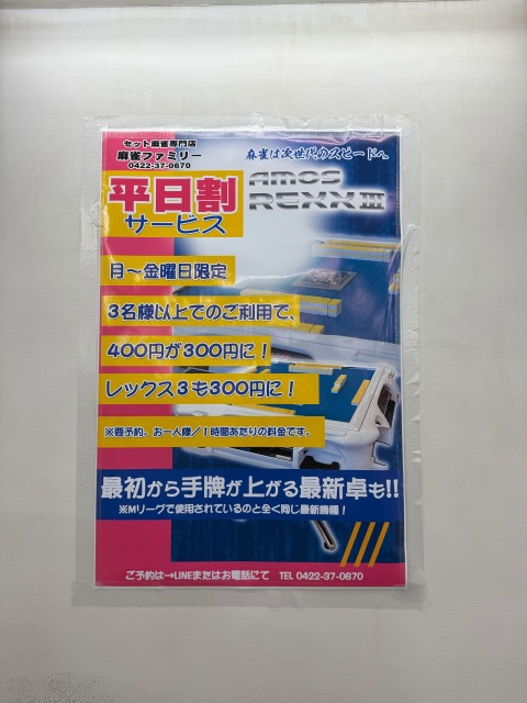 麻雀 ファミリー(セット専門店)東京都 マージャン ファミリー ミタカキタグチテン 東京都 三鷹駅 三鷹駅・北口徒歩1分 四麻、セット、健康麻雀、三麻 電話する0422-37-0670 地図 店舗トップ ルール 写真/動画 イベント 求人 クーポン プロ イチオシ ランキング クチコミ 総合 麻雀 ファミリー(セット専門店) - 5 0 ? 点数について 0件 詳細 雀荘クチコミの点数概要 クチコミの点数は、総合点数を中心に、全部で11項目あります。 12項目は「雀荘の営業形態についての項目」と「その他の環境についての項目」の2つにわかれます。 総合スコア (計11項目) 営業形態点数 (6項目) 雀荘の営業形態についての点数 フリー セット 健康麻雀 麻雀教室 ノーレート 三麻 その他の環境点数 (5項目) 雀荘の設備、その他の環境についての点数 設備 接客 居心地 CP(コストパフォーマンス)・清潔感 ※麻雀王国雀荘検索のクチコミの点数は、当社独自の基準に基づく評価であり、雀荘の価値を何ら保証するものではあ りません。あくまでの一つの参考としてご活用ください。 雀荘クチコミ点数の算出方法要 クチコミの点数は、「ユーザー評価」に独自のアルゴリズムで掛け合わせて算出しております。 麻雀王国では、日々信頼性の高い点数を追及し、微調整を行っております。 ユーザー評価 個人が付けた点数 (雰囲気、感性、感覚、状況、主観など) フリー- セット- 健康麻雀- 麻雀教室- ノーレート- 三麻- 設備 - | 接客 - | 居心地 - | CP(コストパフォーマンス) - | 清潔感 - セット ¥1,200/般 ¥800/学 全国* 東京都* 【東京都武蔵野市・三鷹駅】麻雀 ファミリー(セット専門店)は、四麻・セット・健康麻雀・三麻が楽しめる雀荘です。 ✨三鷹駅北口・徒歩一分のセット麻雀専門店です✨ Mリーグでも採用されていますレックス3を追加導入!! 広々店内の総卓数17卓!レックス3は9卓 年末年始料金 12月26日~1月4日迄 レックス3:1時間1800円 ニンジャ:1時間1400円 【!!大募集中!!】 一緒に働いてくださる社員さん募集中! 月給30万円~ 徒歩1分に寮がございます。 詳細は店舗にご確認ください。 2時間以上ご利用いただいたお客様には、うどんかそば無料でご提供致します!! ※12時半~15時、18時~21時の間になります。 また超お得な平日割も実施中 ※要予約 是非皆様のご来店お待ちしております。 アルコール以外は持ち込み自由 その他フードドリンク多数取り揃えております。 動画撮影禁止 続きを見る 閉じる お店のイチオシポイント イチオシ 1 超お得平日割 月~金限定 4名様の場合400円が300円に! レックス3も300円 ※要予約 ※お一人様/1時間 イチオシ 2 うどんそば無料サービス! 来店2時間以上でうどんそばを無料サービス中♪ お店のコトを友達に教える Facebook X(旧Twitter) Line Mail お店を評価する 閉店・休業・移転・情報違い報告 クチコミ投稿 報告内容詳細※必須 閉店 休業 移転 情報違い 送信する 「ネット予約」&「チェックイン」で 来店人数×100Gもらえる! ログイン ご予約情報入力 来店日※ 2013年12月31日(火) 卓数※ 12345678910卓 予定開始※ 1:00 2:00 3:00 4:00 5:00 6:00 7:00 8:00 9:00 10:00 11:00 12:00 13:00 14:00 15:00 16:00 17:00 18:00 19:00 20:00 21:00 22:00 23:00 24:00 予定終了※ 1:00 2:00 3:00 4:00 5:00 6:00 7:00 8:00 9:00 10:00 11:00 12:00 13:00 14:00 15:00 16:00 17:00 18:00 19:00 20:00 21:00 22:00 23:00 24:00 お名前※ 携帯TEL※ メール※ ルール※ 四麻 三麻 点数※ 25000点 30000点 赤枚数※ 赤5マン01234 赤5ピン01234 赤5ソー01234 その他 チップ 焼鳥 備考 予約する クチコミ 投稿する お店独自のHP・ソーシャル X (旧twitter) 自社HP お店の情報詳細 店名 麻雀 ファミリー(セット専門店) 住所 〒180-0006 [地図] 東京都武蔵野市中町1-5-8 親和ビル3F 電話 0422-37-0670 交通手段 JR中央・総武線 三鷹駅 三鷹駅・北口徒歩1分 三鷹駅北口を背にして、左前にある三井住友銀行右側と喫茶ルノアールの間の道に入ります。 すぐ右手に見える自転車の車輪が沢山ついてる建物の3階が当店になります 営業時間 オープン~ラスト 定休日 年中無休 配牌有り卓のレックスⅢを9卓★導入済み! 営業内容 四麻、セット、健康麻雀、三麻 ゲーム代(フリー) ゲーム代(セット) ¥1,200/般 ¥800/学 [※GW、お正月は特別料金になります。 詳細は店舗にてご確認ください。] ゲーム代(健康麻雀) [毎週(火)(水)10:00~16:00の間に開催中 料金などは当店と違うので 詳しくはMTKフレンズに直接お電話してお聞きください MTKフレンズ(健康麻将三鷹支部) 代表:小嶋さん 090-2916-2588 ] ゲーム代(麻雀教室) その他の料金 レックスⅢは1時間400円学生250円※1人 オープン日 お店のサービス・システム・設備 総卓数 17卓 卓種 点数表示付全自動卓×11全自動配牌卓×6 サービス フリードリンク、自動配牌卓、パック料金、学割、軽食無料 システム・設備 ネット環境、PC、タブレット、スマホ 備考 関連エリア・路線 東京都の雀荘ランキング 三鷹駅の雀荘ランキング 東京都の雀荘特集 東京都武蔵野市の雀荘特集 三鷹駅の雀荘特集 お店を利用する 電話する0422-37-0670 地図東京都武蔵野市中町1-5-8 親和ビル3F [ 管理者ページ ]