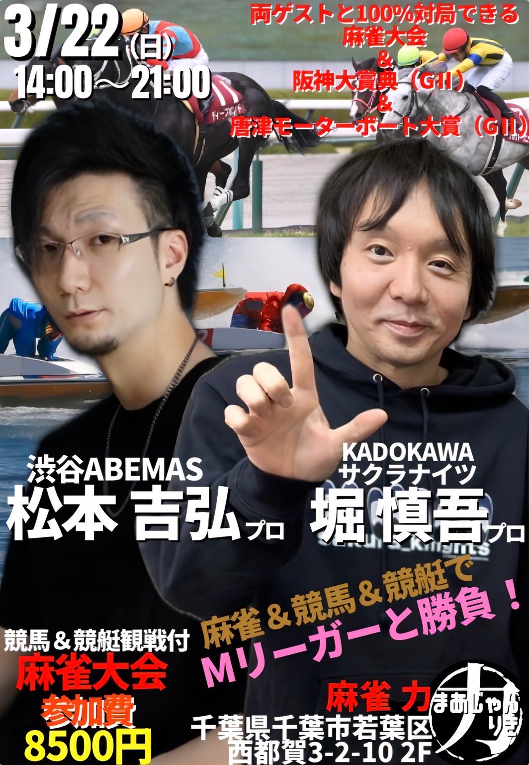 麻雀 力(りき)千葉県 マージャン リキ 千葉県 都賀駅 西口から徒歩30秒 ノーレート、フリー、セット、麻雀教室 電話する043-287-9944 地図 店舗トップ ルール 写真/動画 イベント 求人 クーポン プロ イチオシ ランキング クチコミ 総合 麻雀 力(りき) 3.0 5 21 ? 点数について 21件 詳細 雀荘クチコミの点数概要 クチコミの点数は、総合点数を中心に、全部で11項目あります。 12項目は「雀荘の営業形態についての項目」と「その他の環境についての項目」の2つにわかれます。 総合スコア (計11項目) 営業形態点数 (6項目) 雀荘の営業形態についての点数 フリー セット 健康麻雀 麻雀教室 ノーレート 三麻 その他の環境点数 (5項目) 雀荘の設備、その他の環境についての点数 設備 接客 居心地 CP(コストパフォーマンス)・清潔感 ※麻雀王国雀荘検索のクチコミの点数は、当社独自の基準に基づく評価であり、雀荘の価値を何ら保証するものではあ りません。あくまでの一つの参考としてご活用ください。 雀荘クチコミ点数の算出方法要 クチコミの点数は、「ユーザー評価」に独自のアルゴリズムで掛け合わせて算出しております。 麻雀王国では、日々信頼性の高い点数を追及し、微調整を行っております。 ユーザー評価 個人が付けた点数 (雰囲気、感性、感覚、状況、主観など) フリー3.0 セット3.0 健康麻雀3.0 麻雀教室3.0 ノーレート3.0 三麻3.0 設備 3.0 | 接客 3.0 | 居心地 3.0 | CP(コストパフォーマンス) 3.0 | 清潔感 3.0 フリー ¥400/般 セット ¥250/般 ¥200/学 長期契約安心店舗 全国17位 千葉県1位 【千葉県千葉市若葉区・都賀駅】麻雀 力(りき)は、ノーレート・フリー・セット・麻雀教室が楽しめる雀荘です。 ☆2023年7/1 リニューアルオープン☆ Mリーグルールノーレートフリー専門店に生まれ変わりました。 JR都賀駅西口から徒歩30秒の駅チカ雀荘です!! ぜひ麻雀力へお越しください♪♪ 当店は「お客様に気持ち良く過ごして頂ける麻雀店」をモットーに日々努力しております。 女性のお客様、お一人様もノーレートフリーなので、お気軽にご来店ください。 毎週土曜日にMリーガーなどの有名プロと100%対局出来る麻雀大会も開催しております。 ぜひご参加ください♪♪ 続きを見る 閉じる お店のイチオシポイント イチオシ 1 Mリーガーと100%対局できる麻雀大会開催中! 毎週開催している 有名プロと100%対局できる麻雀大会。 日吉辰哉 プロ 東城りお プロ 二階堂亜樹 プロ 二階堂瑠美 プロ 多井隆晴 プロ 松ヶ瀬隆弥 プロ 佐々木寿人 プロ 萩原聖人 プロ 渋川難波 プロ 土田浩翔 プロ 黒沢咲 プロ 勝又健志 プロ 松本吉弘 プロ 日向藍子 プロ 猿川真寿 プロ 渡辺太 プロ 襟川麻衣子 プロ 村上淳 プロ 丸山奏子 プロ 藤崎智 プロ 松嶋桃 プロ 本田朋広 プロ 瀬戸熊直樹 プロ 醍醐大 プロ 石橋伸洋 プロ 和久津晶 プロ 沢崎誠 プロ 小林剛 プロ 茅森早香 プロ 鈴木大介 プロ 堀慎吾 プロ 園田賢 プロ 浅井堂岐 プロ 鈴木優 プロ 仲林圭 プロ 滝沢和典 プロ 魚谷侑未 プロ 鈴木たろう プロ 浅見真紀 プロ 菅原千瑛 プロ 内川幸太郎 プロ 朝倉康心 プロ 河野直也 プロ 白鳥翔 プロ 瑞原明奈 プロ 前原雄大プロ 古橋崇志 プロ 小林未沙 さん HIRO柴田プロ 藤沢晴信 プロ 竹内元太 プロ 下石戟プロ 逢川恵夢プロ 高宮まりプロ 阿久津翔太プロ 三浦智博プロ 木下遥プロ 川上レイ プロ 梶梨沙子プロ 来店済み。 今後もMリーグ関係プロ 続々来店予定です。 イチオシ 2 Mリーグルールノーレートフリー専門店に生まれ変わりました。 2023年7月1日より、当店は Mリーグルールノーレートフリー専門店に生まれ変わりました。 イチオシ 3 IKUSA団体戦に「TEAM麻雀 力」参戦中! 麻雀 力は、IKUSA団体戦に参戦中! 「TEAM麻雀 力」は、「協会のグランドスラム(雀王戦・雀竜位戦・日本オープン優勝)」達成の矢島亨プロ、シンデレラファイト、桜蕾戦優勝の鴨舞プロ、WRCリーグ・桜蕾戦優勝の朝比奈ゆりプロとタイトルホルダー揃い。応援宜しくお願い致します。 お店のコトを友達に教える Facebook X(旧Twitter) Line Mail お店を評価する 閉店・休業・移転・情報違い報告 クチコミ投稿 報告内容詳細※必須 閉店 休業 移転 情報違い 送信する 最新情報 2026年1月24日(土) イベント ほりぽよ&まつもってぃと100%対局できる麻雀大会🀄️ KADOKAWAサクラナイツ 所属 堀慎吾 プロ & 渋谷ABEMAS 所属 松本吉弘 プロ がご来店! 阪神大賞典と唐津モーターボート大賞の観戦付き🐎🚤 お二人と必ず同卓できます。 こちらのイベントは完売となっております。 「ネット予約」&「チェックイン」で 来店人数×100Gもらえる! ログイン ご予約情報入力 来店日※ 2013年12月31日(火) 卓数※ 12345678910卓 予定開始※ 1:00 2:00 3:00 4:00 5:00 6:00 7:00 8:00 9:00 10:00 11:00 12:00 13:00 14:00 15:00 16:00 17:00 18:00 19:00 20:00 21:00 22:00 23:00 24:00 予定終了※ 1:00 2:00 3:00 4:00 5:00 6:00 7:00 8:00 9:00 10:00 11:00 12:00 13:00 14:00 15:00 16:00 17:00 18:00 19:00 20:00 21:00 22:00 23:00 24:00 お名前※ 携帯TEL※ メール※ ルール※ 四麻 三麻 点数※ 25000点 30000点 赤枚数※ 赤5マン01234 赤5ピン01234 赤5