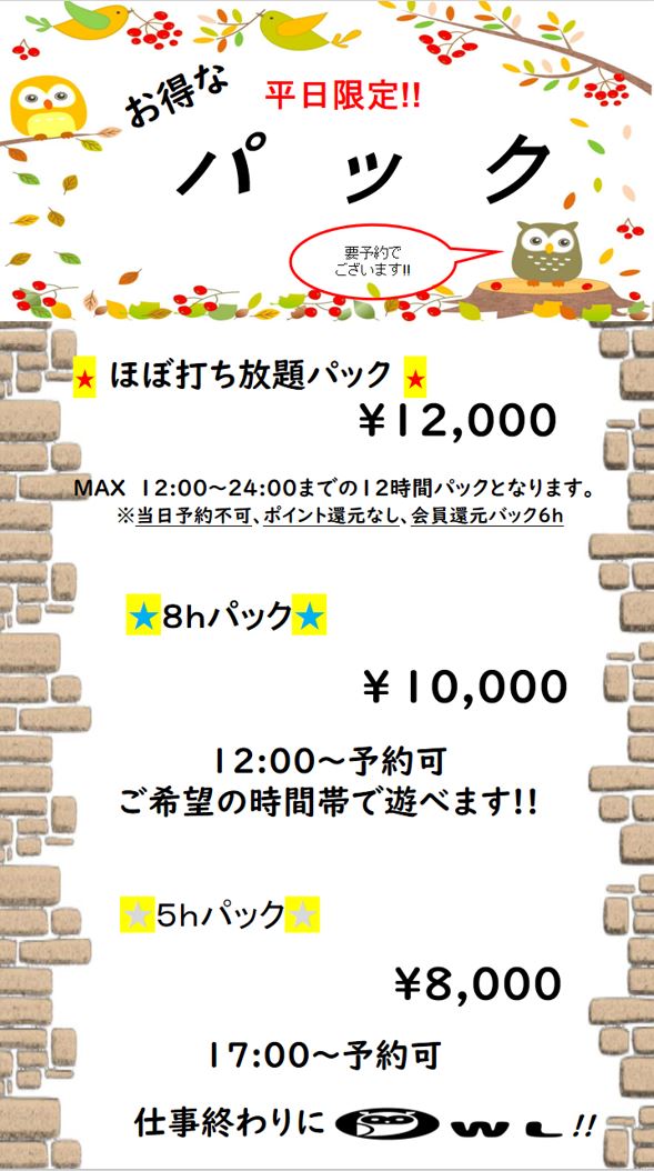 【週末パック:土日祝限定】8:00~24:00 12時間 ¥11,000