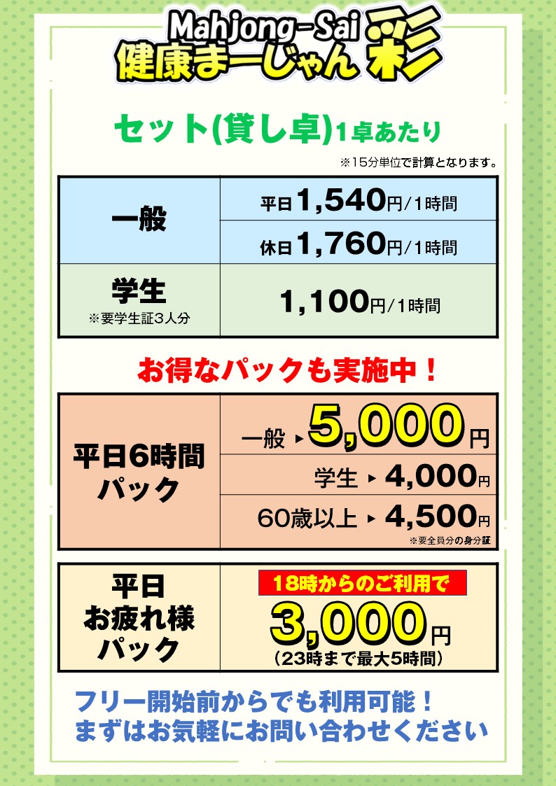 四麻、フリー、セット、健康麻雀、麻雀教室、ノーレート |